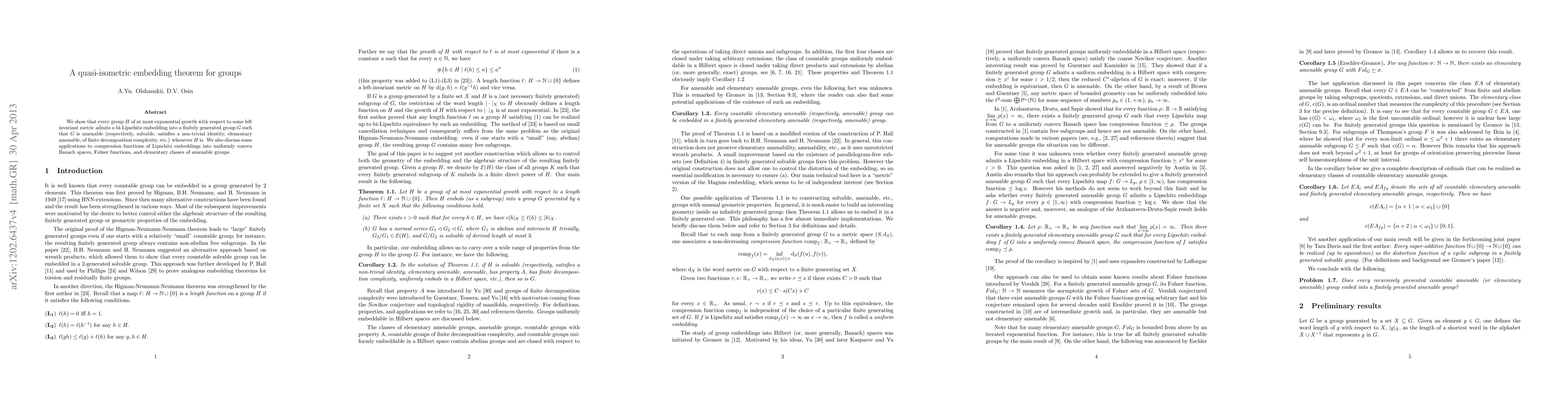 We show that every group $H$ of at most exponential growth with respect to some left invariant metric admits a bi-Lipschitz embedding into a finitely generated group $G$ such that $G$ is amenable (respectively, solvable, satisfies a non-trivial identity, elementary amenable, of finite decomposition complexity, etc.) whenever $H$ is. We also discuss some applications to compression functions of Lipschitz embeddings into uniformly convex Banach spaces, F{\o}lner functions, and elementary classes of amenable groups.