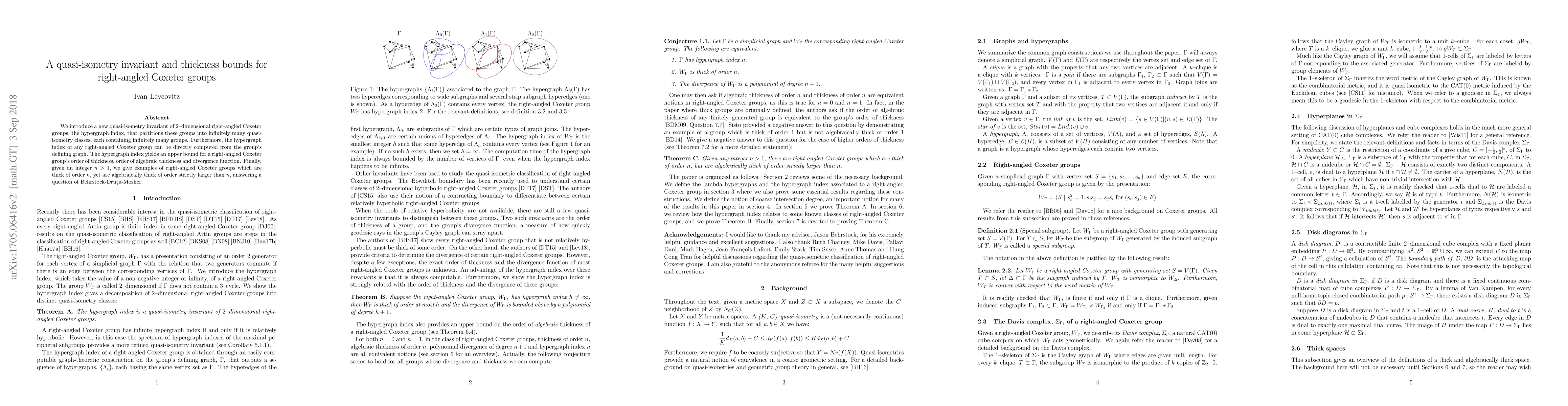 This paper introduces a new quasi-isometry invariant, the hypergraph index, for 2-dimensional right-angled Coxeter groups, which classifies groups into infinitely many classes and correlates with bounds on their thickness. It also demonstrates examples of groups thick of a given order but algebraically thick of a higher order.