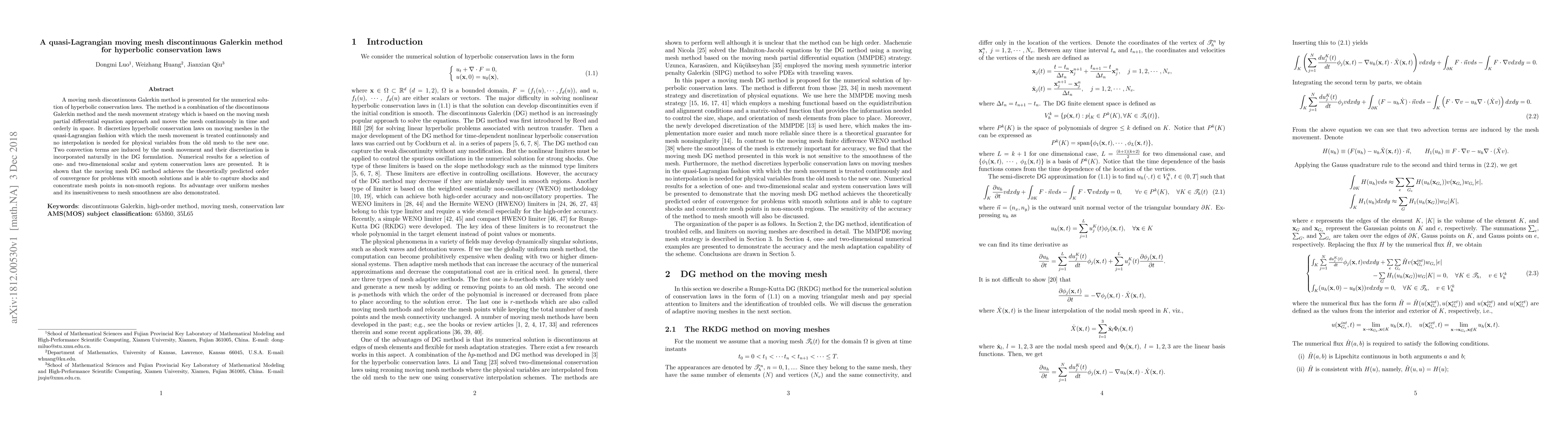 The paper proposes a quasi-Lagrangian moving mesh discontinuous Galerkin method for solving hyperbolic conservation laws, combining DG and mesh movement to achieve high convergence rates and shock capturing, with no need for variable interpolation between meshes. Numerical results validate its efficiency and accuracy.