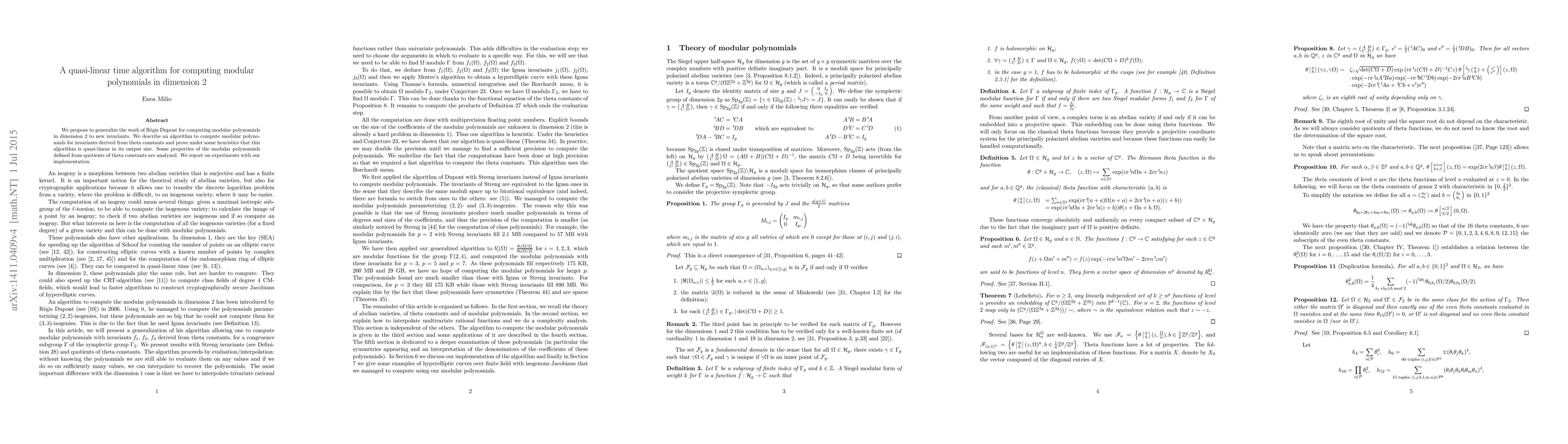 Researchers propose a quasi-linear time algorithm for computing modular polynomials in 2D dimension, generalizing previous work on theta constants.