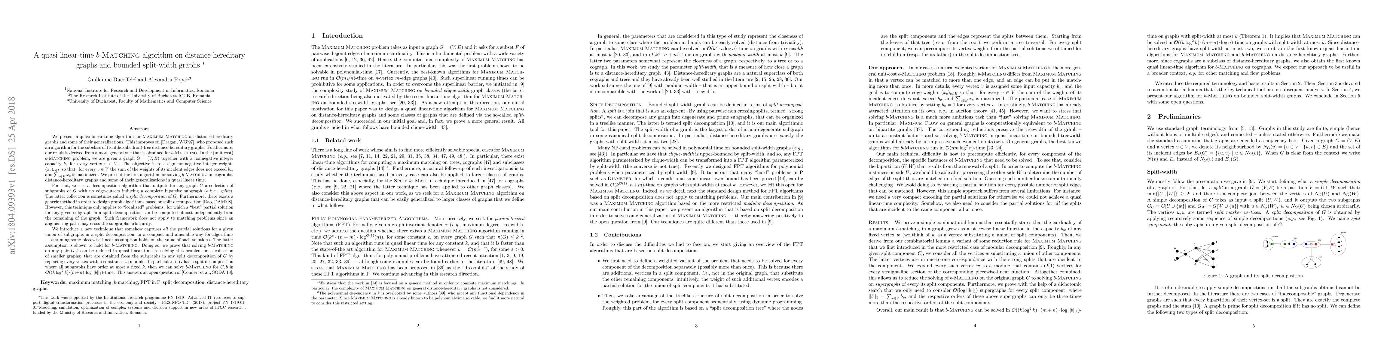 This paper presents a quasi linear-time algorithm for Maximum Matching and b-Matching on distance-hereditary graphs and their generalizations, improving upon previous results. The authors introduce a novel decomposition technique that captures partial solutions in a compact form, enabling efficient computation on split decompositions, and solve b-Matching in O((k log 2 k)×(m+n)×log ||b|| 1)-time for graphs with a split decomposition of bounded size k.