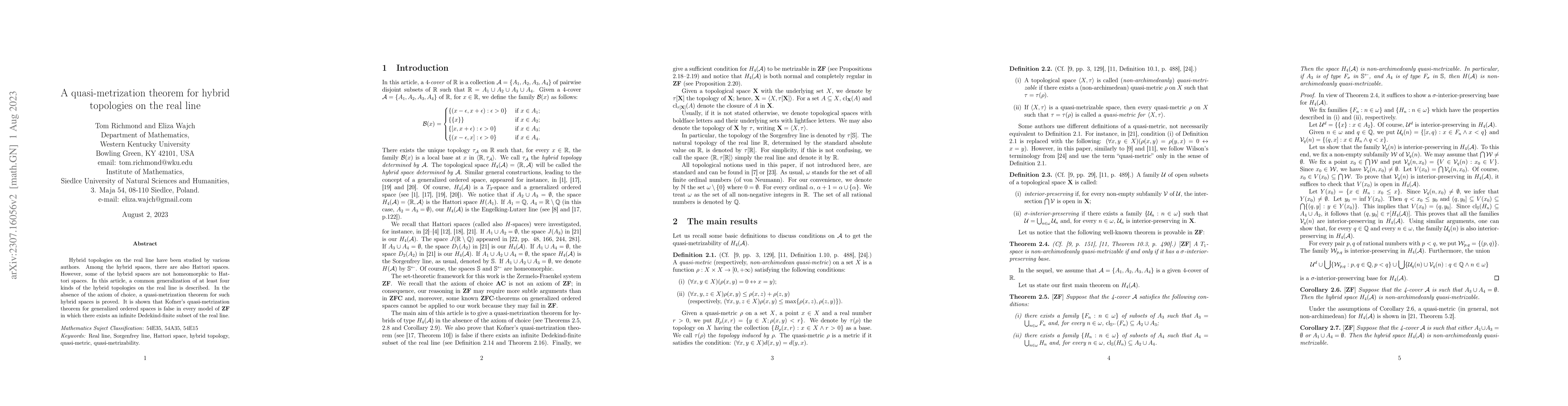 Hybrid topologies on the real line have been studied by various authors. Among the hybrid spaces, there are also Hattori spaces. However, some of the hybrid spaces are not homeomorphic to Hattori spaces. In this article, a common generalization of at least four kinds of the hybrid topologies on the real line is described. In the absence of the axiom of choice, a quasi-metrization theorem for such hybrid spaces is proved. It is shown that Kofner's quasi-metrization theorem for generalized ordered spaces is false in every model of $\mathbf{ZF}$ in which there exists an infinite Dedekind-finite subset of the real line.
