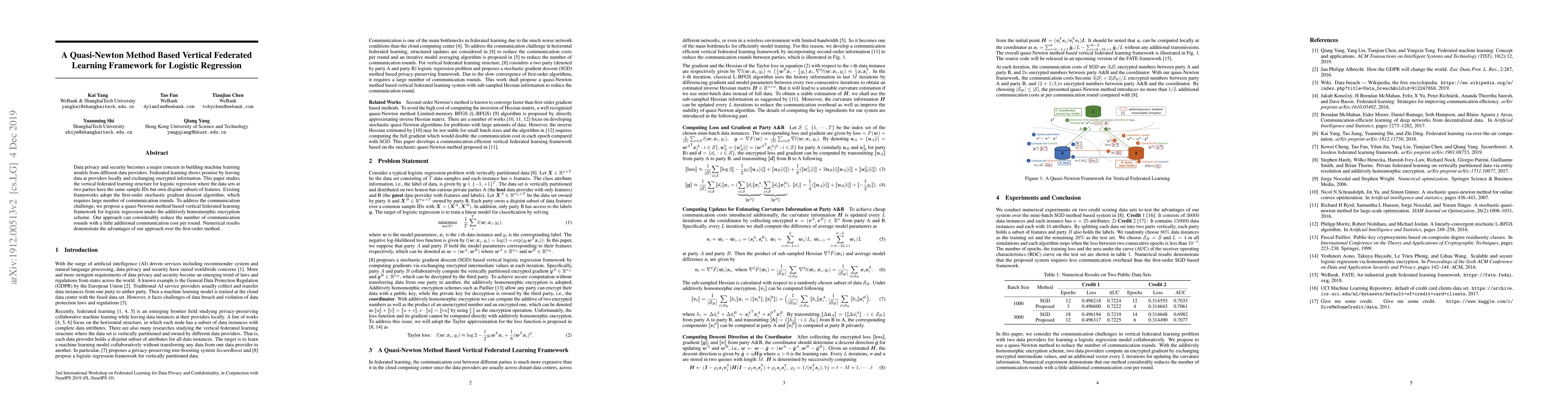 This paper proposes a quasi-Newton method for vertical federated learning in logistic regression to reduce communication rounds, addressing data privacy concerns. The new framework under additively homomorphic encryption shows significant reduction in communication rounds compared to the first-order method, with numerical results validating its efficiency.