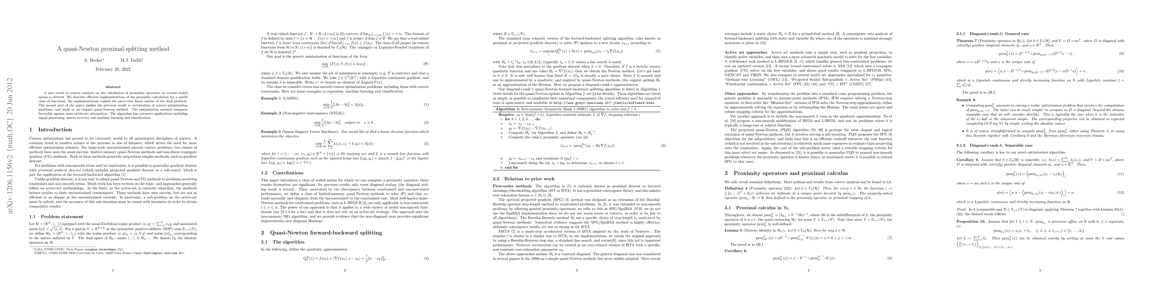 A new result in convex analysis on the calculation of proximity operators in certain scaled norms is derived. We describe efficient implementations of the proximity calculation for a useful class of functions; the implementations exploit the piece-wise linear nature of the dual problem. The second part of the paper applies the previous result to acceleration of convex minimization problems, and leads to an elegant quasi-Newton method. The optimization method compares favorably against state-of-the-art alternatives. The algorithm has extensive applications including signal processing, sparse recovery and machine learning and classification.