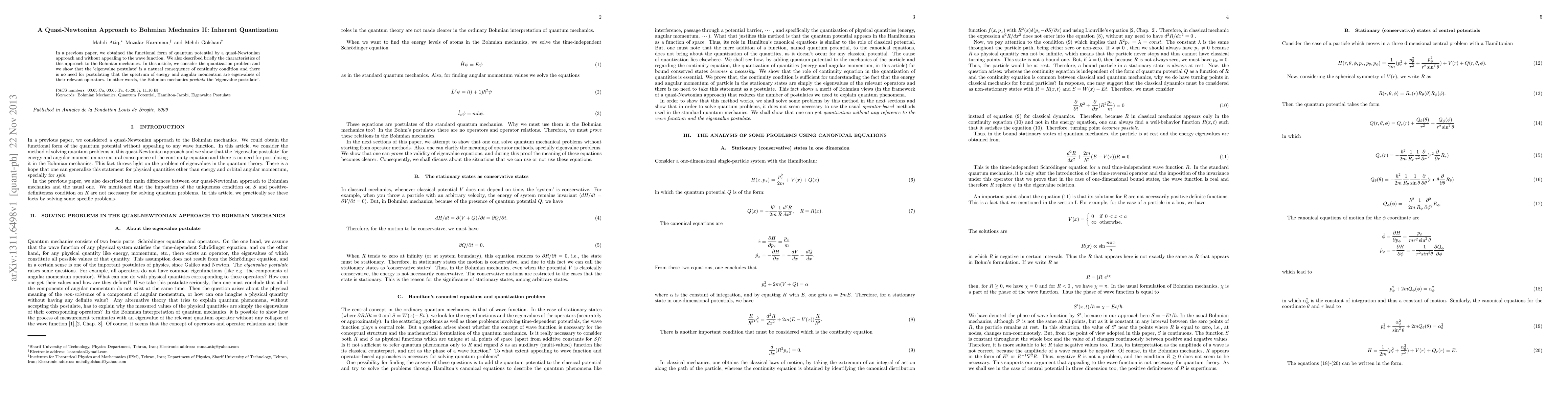 In a previous paper, we obtained the functional form of quantum potential by a quasi-Newtonian approach and without appealing to the wave function. We also described briefly the characteristics of this approach to the Bohmian mechanics. In this article, we consider the quantization problem and we show that the 'eigenvalue postulate' is a natural consequence of continuity condition and there is no need for postulating that the spectrum of energy and angular momentum are eigenvalues of their relevant operators. In other words, the Bohmian mechanics predicts the 'eigenvalue postulate'.