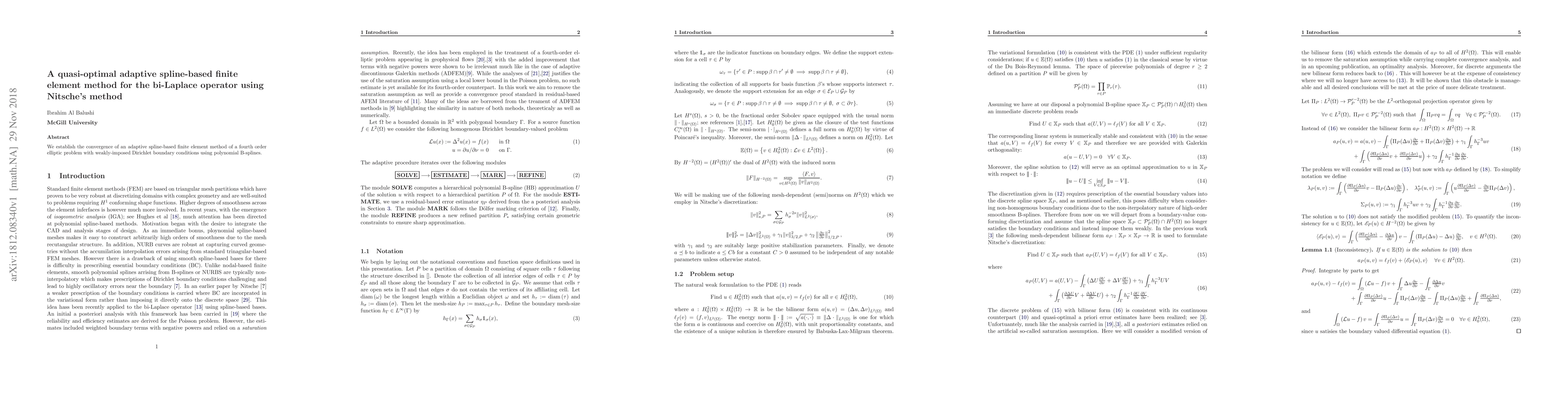 Summary: This paper presents an adaptive spline-based finite element method for solving a fourth-order elliptic problem, demonstrating its convergence and utilizing Nitsche's method for weakly-imposed Dirichlet boundary conditions. The approach employs polynomial B-splines for enhanced accuracy.