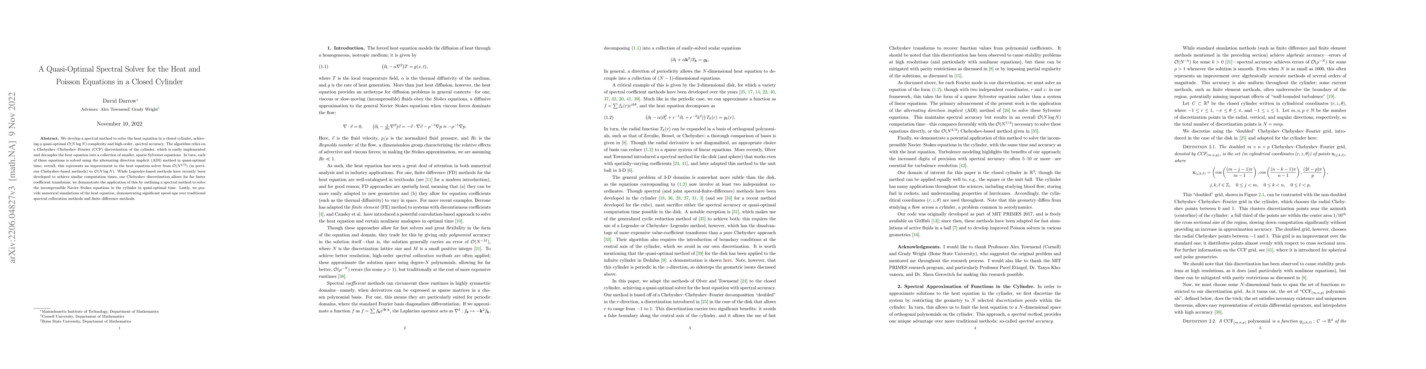We develop a spectral method to solve the heat equation in a closed cylinder, achieving a quasi-optimal $\mathcal{O}(N\log N)$ complexity and high-order, spectral accuracy. The algorithm relies on a Chebyshev--Chebyshev--Fourier (CCF) discretization of the cylinder, which is easily implemented and decouples the heat equation into a collection of smaller, sparse Sylvester equations. In turn, each of these equations is solved using the alternating direction implicit (ADI) method in quasi-optimal time; overall, this represents an improvement in the heat equation solver from $\mathcal{O}(N^{4/3})$ (in previous Chebyshev-based methods) to $\mathcal{O}(N\log N)$. While Legendre-based methods have recently been developed to achieve similar computation times, our Chebyshev discretization allows for far faster coefficient transforms; we demonstrate the application of this by outlining a spectral method to solve the incompressible Navier--Stokes equations in the cylinder in quasi-optimal time. Lastly, we provide numerical simulations of the heat equation, demonstrating significant speed-ups over traditional spectral collocation methods and finite difference methods.