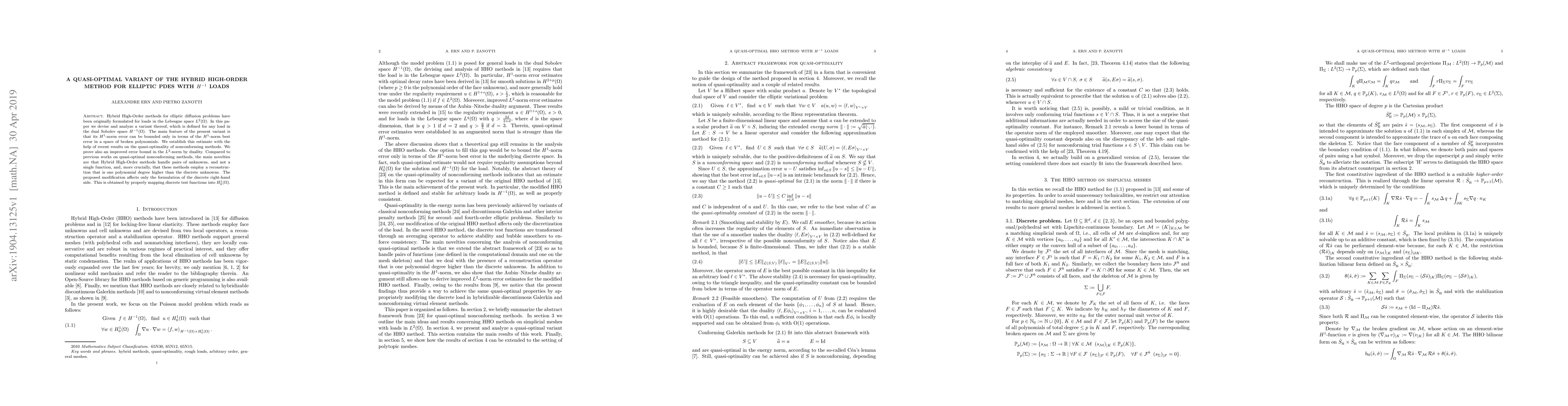 Hybrid High-Order methods for elliptic diffusion problems have been originally formulated for loads in the Lebesgue space $L^2(\Omega)$. In this paper we devise and analyze a variant thereof, which is defined for any load in the dual Sobolev space $H^{-1}(\Omega)$. The main feature of the present variant is that its $H^1$-norm error can be bounded only in terms of the $H^1$-norm best error in a space of broken polynomials. We establish this estimate with the help of recent results on the quasi-optimality of nonconforming methods. We prove also an improved error bound in the $L^2$-norm by duality. Compared to previous works on quasi-optimal nonconforming methods, the main novelties are that Hybrid High-Order methods handle pairs of unknowns, and not a single function, and, more crucially, that these methods employ a reconstruction that is one polynomial degree higher than the discrete unknowns. The proposed modification affects only the formulation of the discrete right-hand side. This is obtained by properly mapping discrete test functions into $H^1_0(\Omega)$.