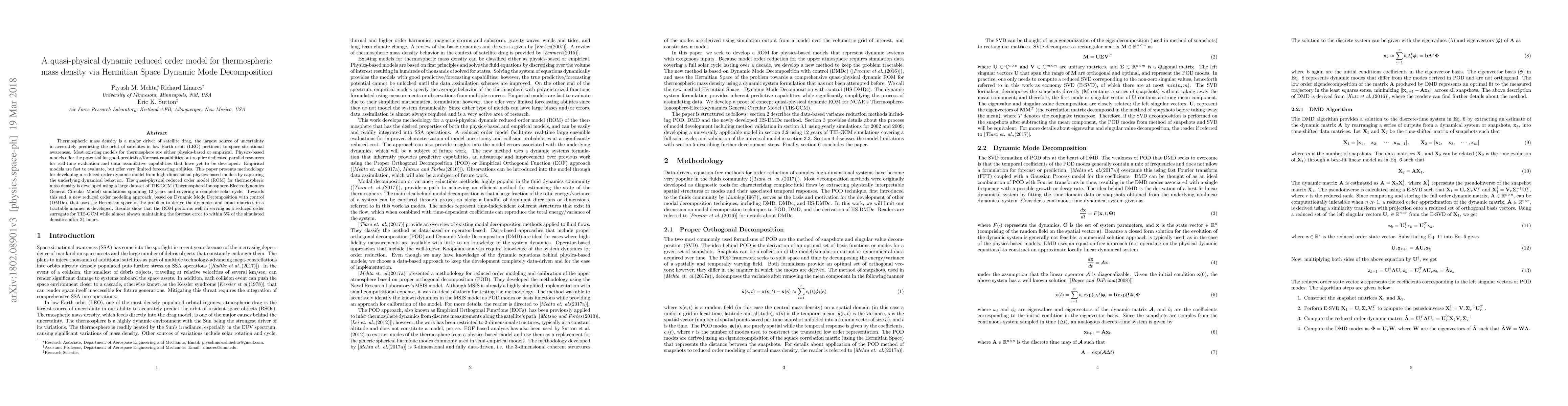 This paper develops a quasi-physical reduced order model (ROM) for thermospheric mass density using Hermitian Space Dynamic Mode Decomposition with control (DMDc) on data from NCAR's TIE-GCM. The ROM effectively captures the dynamical behavior of the high-dimensional physics-based model, maintaining forecast errors within 5% after 24 hours.