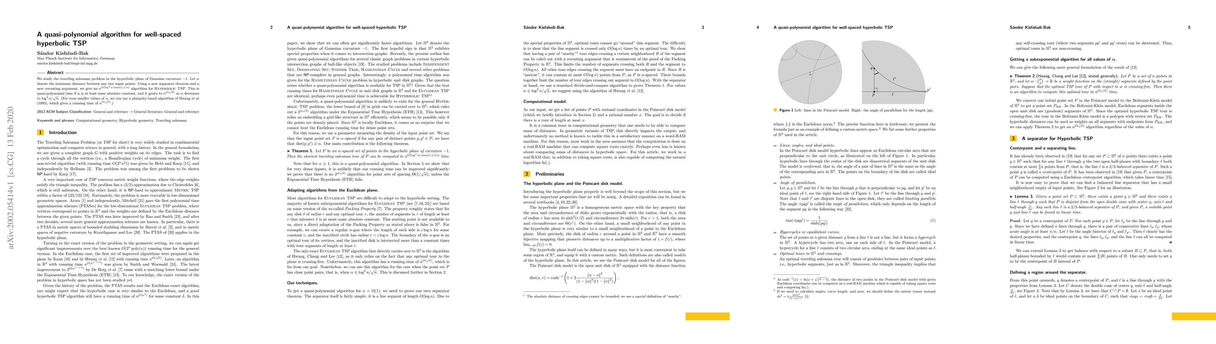 We study the traveling salesman problem in the hyperbolic plane of Gaussian curvature $-1$. Let $\alpha$ denote the minimum distance between any two input points. Using a new separator theorem and a new rerouting argument, we give an $n^{O(\log^2 n)\max(1,1/\alpha)}$ algorithm for Hyperbolic TSP. This is quasi-polynomial time if $\alpha$ is at least some absolute constant, and it grows to $n^{O(\sqrt{n})}$ as $\alpha$ decreases to $\log^2 n/\sqrt{n}$. (For even smaller values of $\alpha$, we can use a planarity-based algorithm of Hwang et al. (1993), which gives a running time of $n^{O(\sqrt{n})}$.)