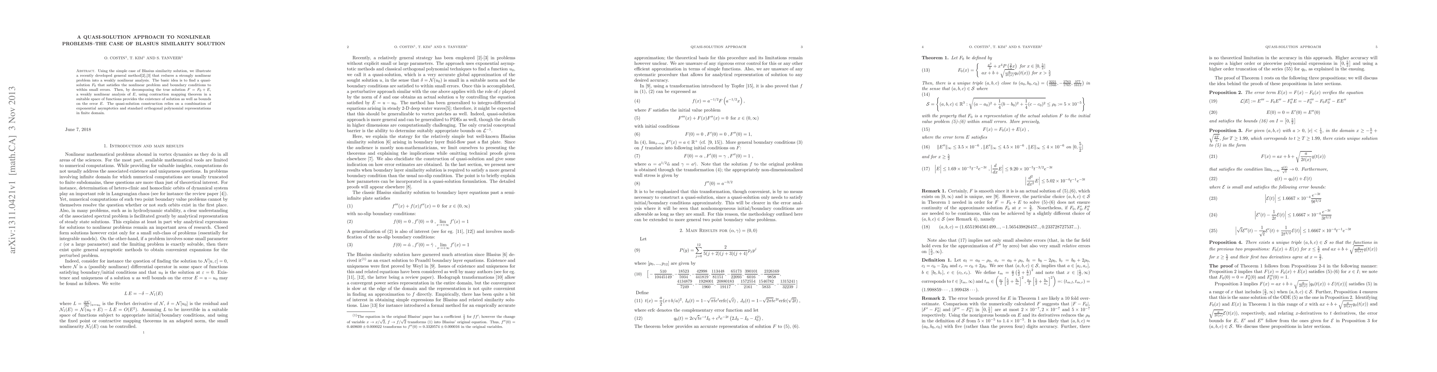 This paper introduces a quasi-solution approach for solving nonlinear problems, exemplified by the Blasius similarity solution. It reduces the problem to a weakly nonlinear analysis by finding a quasi-solution $F_0$ that approximates the true solution $F=F_0+E$, with $E$ analyzed using contraction mapping theorem for error bounds.