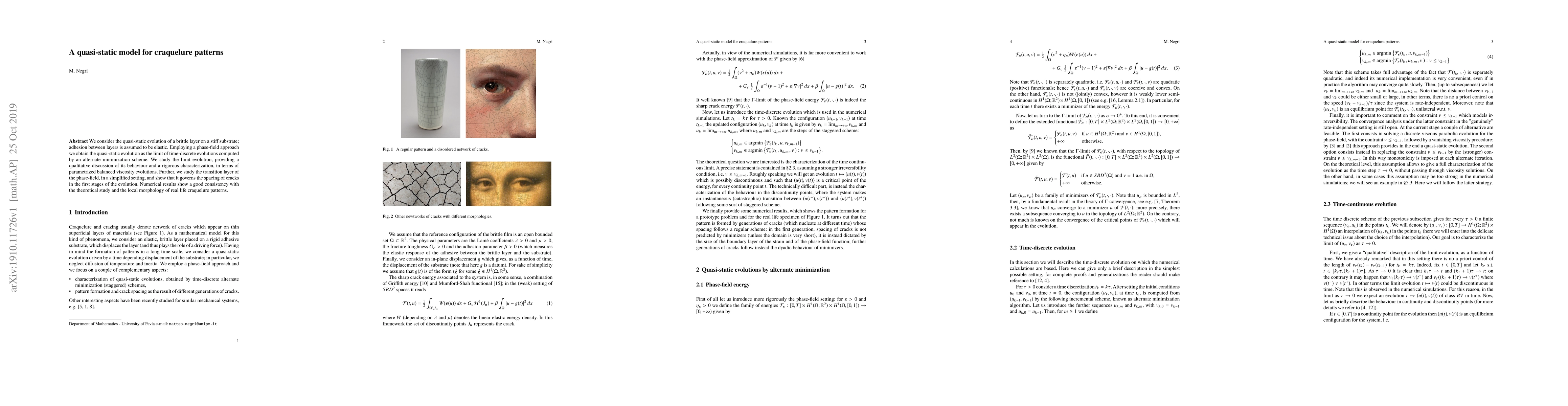 We consider the quasi-static evolution of a brittle layer on a stiff substrate; adhesion between layers is assumed to be elastic. Employing a phase-field approach we obtain the quasi-static evolution as the limit of time-discrete evolutions computed by an alternate minimization scheme. We study the limit evolution, providing a qualitative discussion of its behaviour and a rigorous characterization, in terms of parametrized balanced viscosity evolutions. Further, we study the transition layer of the phase-field, in a simplified setting, and show that it governs the spacing of cracks in the first stages of the evolution. Numerical results show a good consistency with the theoretical study and the local morphology of real life craquelure patterns.
