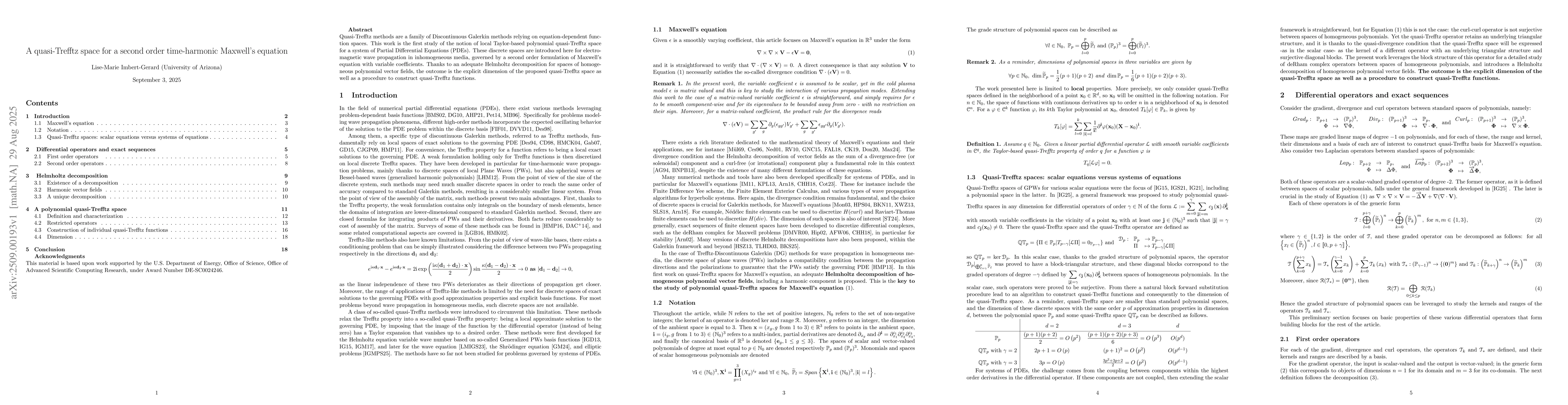 Quasi-Trefftz methods are a family of Discontinuous Galerkin methods relying on equation-dependent function spaces. This work is the first study of the notion of local Taylor-based polynomial quasi-Trefftz space for a system of Partial Differential Equations (PDEs). These discrete spaces are introduced here for electro-magnetic wave propagation in inhomogeneous media, governed by a second order formulation of Maxwell's equation with variable coefficients. Thanks to an adequate Helmholtz decomposition for spaces of homogeneous polynomial vector fields, the outcome is the explicit dimension of the proposed quasi-Trefftz space as well as a procedure to construct quasi-Trefftz functions.