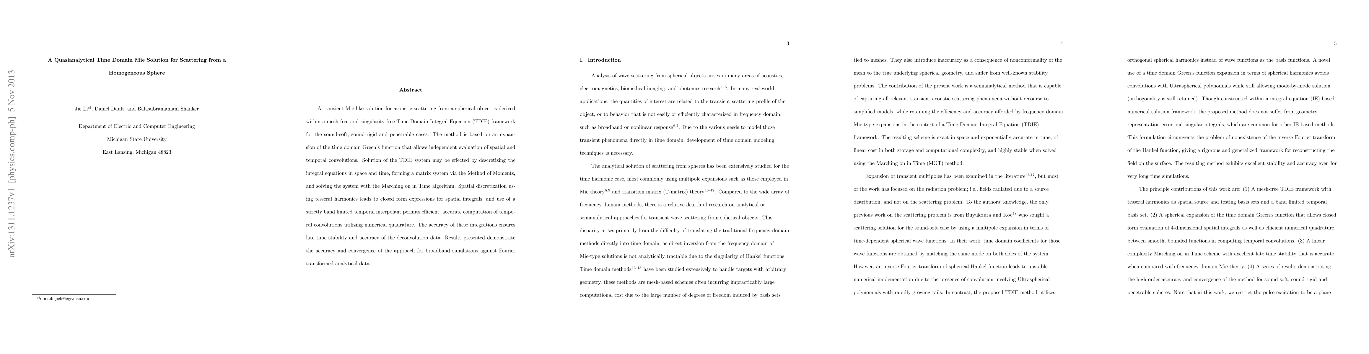 A transient Mie-like solution for acoustic scattering from a spherical object is derived within a mesh-free and singularity-free Time Domain Integral Equation (TDIE) framework for the sound-soft, sound-rigid and penetrable cases. The method is based on an expansion of the time domain Green's function that allows independent evaluation of spatial and temporal convolutions. Solution of the TDIE system may be effected by descretizing the integral equations in space and time, forming a matrix system via the Method of Moments, and solving the system with the Marching on in Time algorithm. Spatial discretization using tesseral harmonics leads to closed form expressions for spatial integrals, and use of a strictly band limited temporal interpolant permits efficient, accurate computation of temporal convolutions utilizing numerical quadrature. The accuracy of these integrations ensures late time stability and accuracy of the deconvolution data. Results presented demonstrate the accuracy and convergence of the approach for broadband simulations against Fourier transformed analytical data.