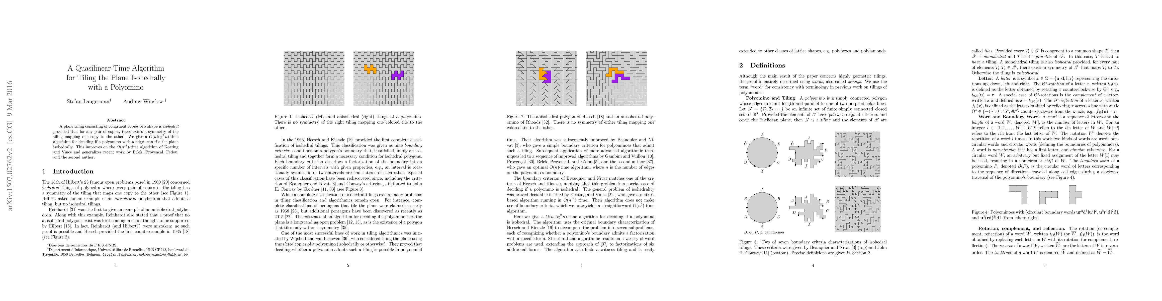 The paper introduces an efficient algorithm for deciding isohedral tiling of the plane by polyominoes, leveraging pre-processing of pre- and suffix palindrome factorizations.