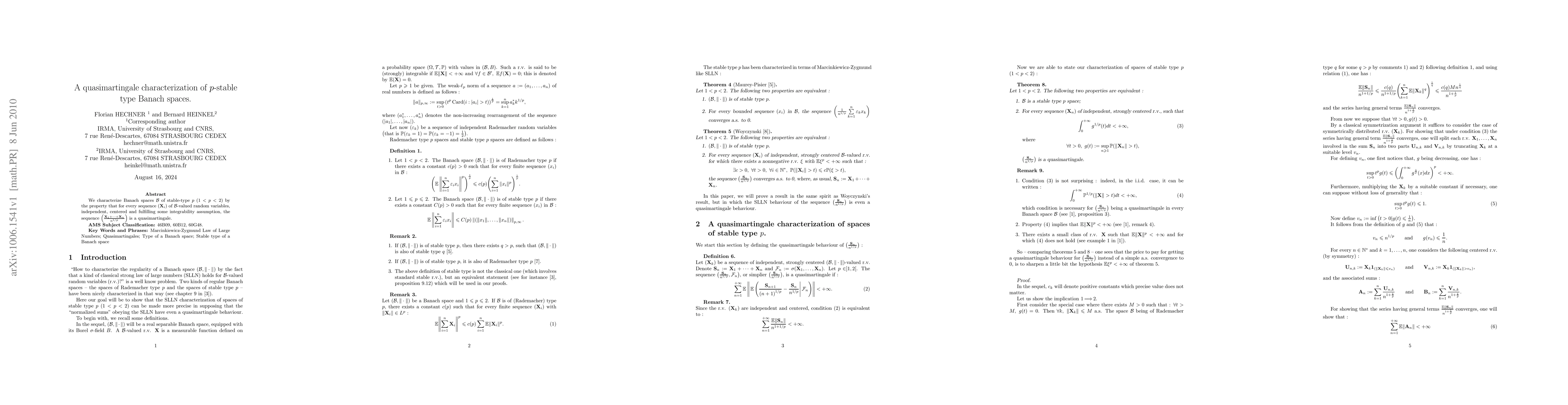 This paper characterizes Banach spaces of stable type p (1 < p < 2) by showing that for any sequence of independent, centered B-valued random variables, the sequence of partial sums normalized by n^(1/p) forms a quasimartingale. This property provides a novel perspective on the structure of such Banach spaces.