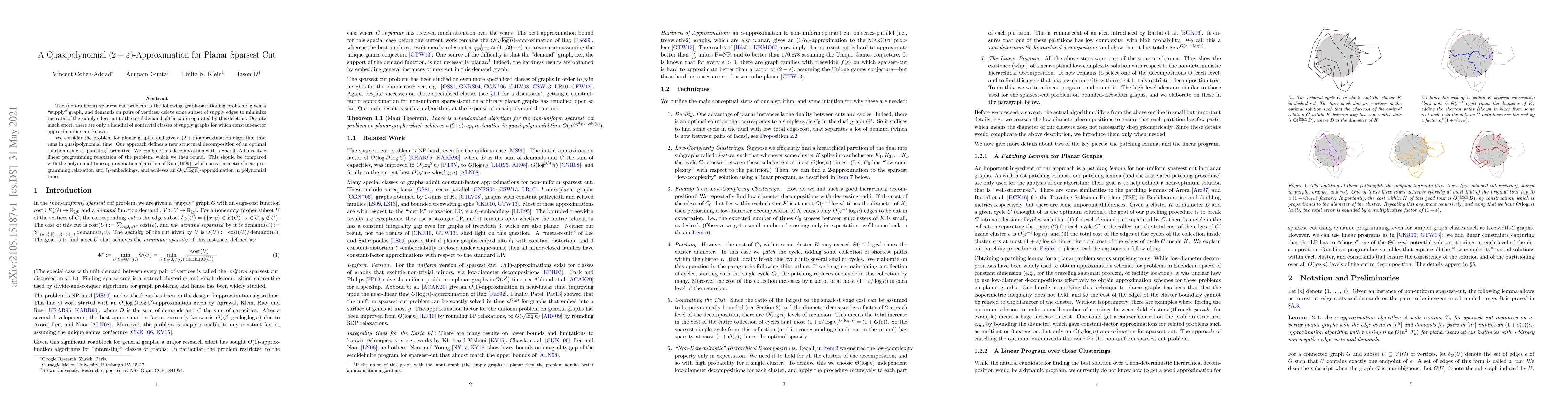 This paper presents a quasipolynomial-time $(2+\varepsilon)$-approximation algorithm for the sparsest cut problem in planar graphs, utilizing a novel structural decomposition and a Sherali-Adams linear programming relaxation. This approach improves upon the polynomial-time $O(\sqrt{\log n})$-approximation algorithm for general graphs.