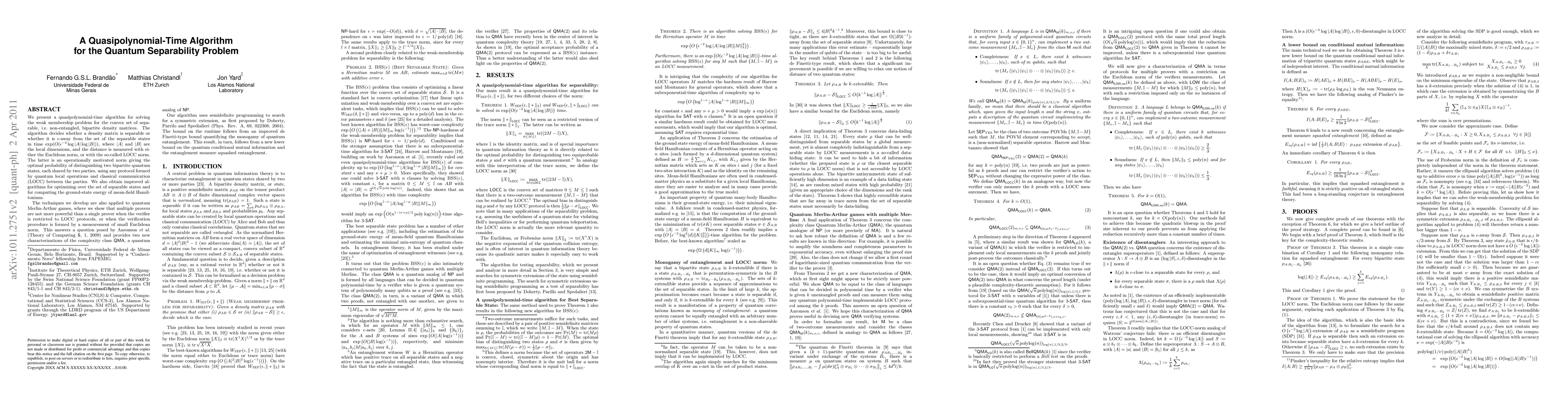 We present a quasipolynomial-time algorithm for solving the weak membership problem for the convex set of separable, i.e. non-entangled, bipartite density matrices. The algorithm decides whether a density matrix is separable or whether it is eps-away from the set of the separable states in time exp(O(eps^-2 log |A| log |B|)), where |A| and |B| are the local dimensions, and the distance is measured with either the Euclidean norm, or with the so-called LOCC norm. The latter is an operationally motivated norm giving the optimal probability of distinguishing two bipartite quantum states, each shared by two parties, using any protocol formed by quantum local operations and classical communication (LOCC) between the parties. We also obtain improved algorithms for optimizing over the set of separable states and for computing the ground-state energy of mean-field Hamiltonians. The techniques we develop are also applied to quantum Merlin-Arthur games, where we show that multiple provers are not more powerful than a single prover when the verifier is restricted to LOCC protocols, or when the verification procedure is formed by a measurement of small Euclidean norm. This answers a question posed by Aaronson et al (Theory of Computing 5, 1, 2009) and provides two new characterizations of the complexity class QMA, a quantum analog of NP. Our algorithm uses semidefinite programming to search for a symmetric extension, as first proposed by Doherty, Parrilo and Spedialieri (Phys. Rev. A, 69, 022308, 2004). The bound on the runtime follows from an improved de Finetti-type bound quantifying the monogamy of quantum entanglement, proved in (arXiv:1010.1750). This result, in turn, follows from a new lower bound on the quantum conditional mutual information and the entanglement measure squashed entanglement.
