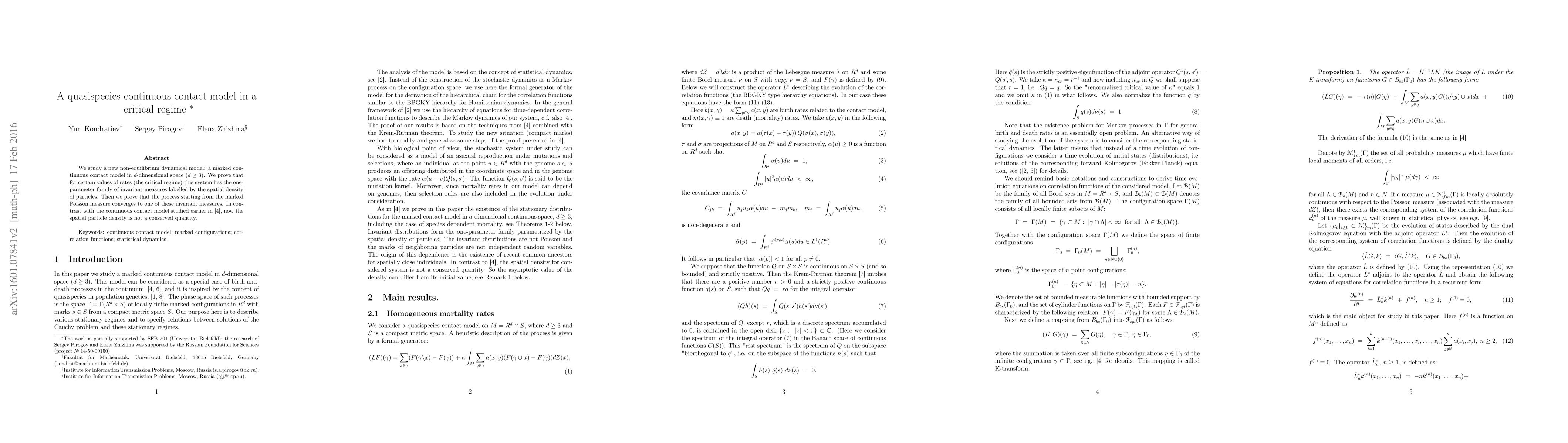 We study a new non-equilibrium dynamical model: a marked continuous contact model in $d$-dimensional space ($d \ge 3$). We prove that for certain values of rates (the critical regime) this system has the one-parameter family of invariant measures labelled by the spatial density of particles. Then we prove that the process starting from the marked Poisson measure converges to one of these invariant measures. In contrast with the continuous contact model studied earlier in \cite{KKP}, now the spatial particle density is not a conserved quantity.