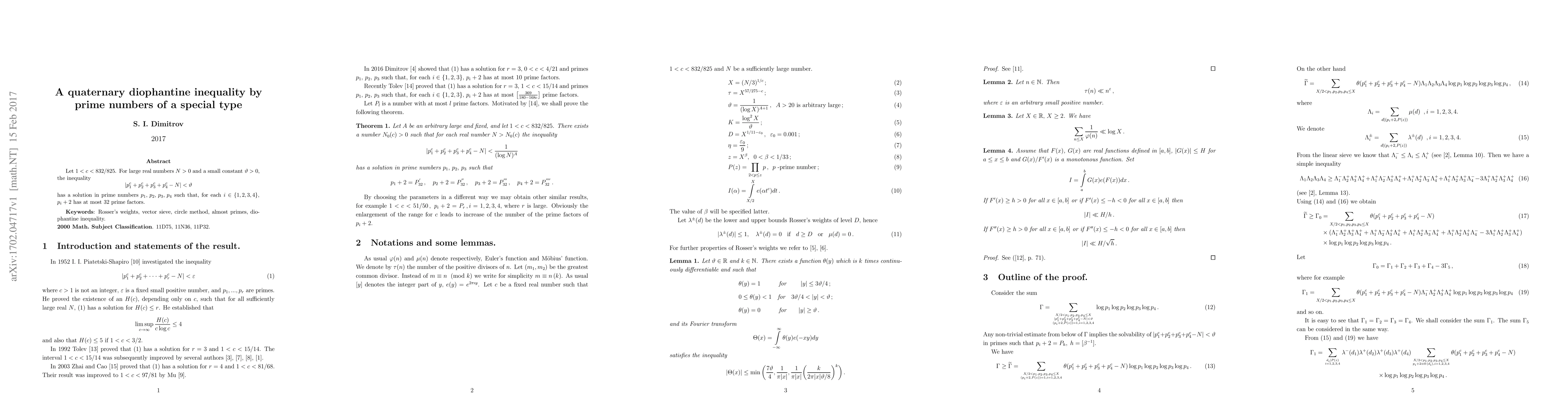 This paper investigates the existence of prime numbers $p_1, p_2, p_3, p_4$ satisfying a quaternary Diophantine inequality for large $N$ and small $\vartheta$, with the condition that $p_i+2$ has at most 32 prime factors for each $i$. The result holds for $1 < c < 832/825$.
