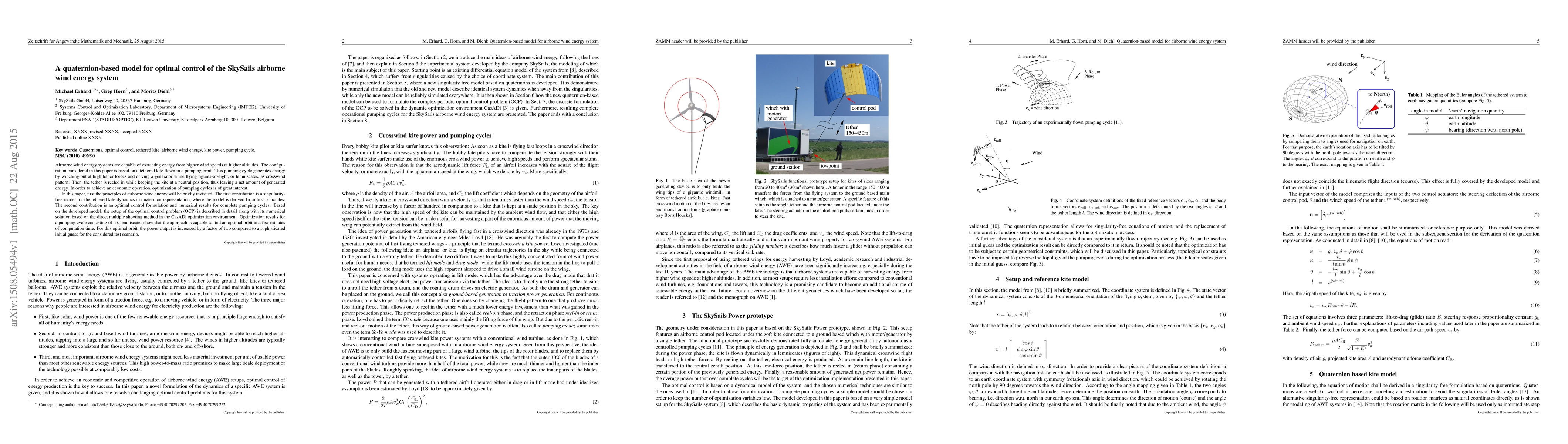 This paper presents a quaternion-based model for optimal control of the SkySails airborne wind energy system, focusing on a tethered kite flown in a pumping orbit. The authors develop an optimal control formulation and demonstrate significant power output increases through efficient numerical optimization.