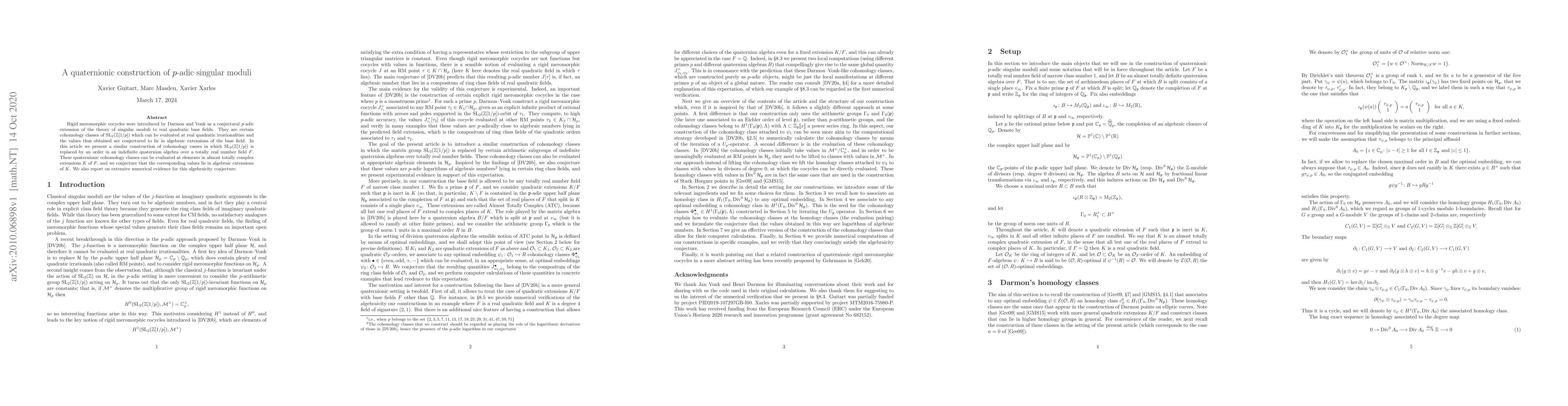 Rigid meromorphic cocycles were introduced by Darmon and Vonk as a conjectural $p$-adic extension of the theory of singular moduli to real quadratic base fields. They are certain cohomology classes of $\mathrm{SL}_2(\mathbb{Z}[1/p])$ which can be evaluated at real quadratic irrationalities and the values thus obtained are conjectured to lie in algebraic extensions of the base field. In this article we present a similar construction of cohomology casses in which $\mathrm{SL}_2(\mathbb{Z}[1/p])$ is replaced by an order in an indefinite quaternion algebra over a totally real number field $F$. These quaternionic cohomology classes can be evaluated at elements in almost totally complex extensions $K$ of $F$, and we conjecture that the corresponding values lie in algebraic extensions of $K$. We also report on extensive numerical evidence for this algebraicity conjecture.
