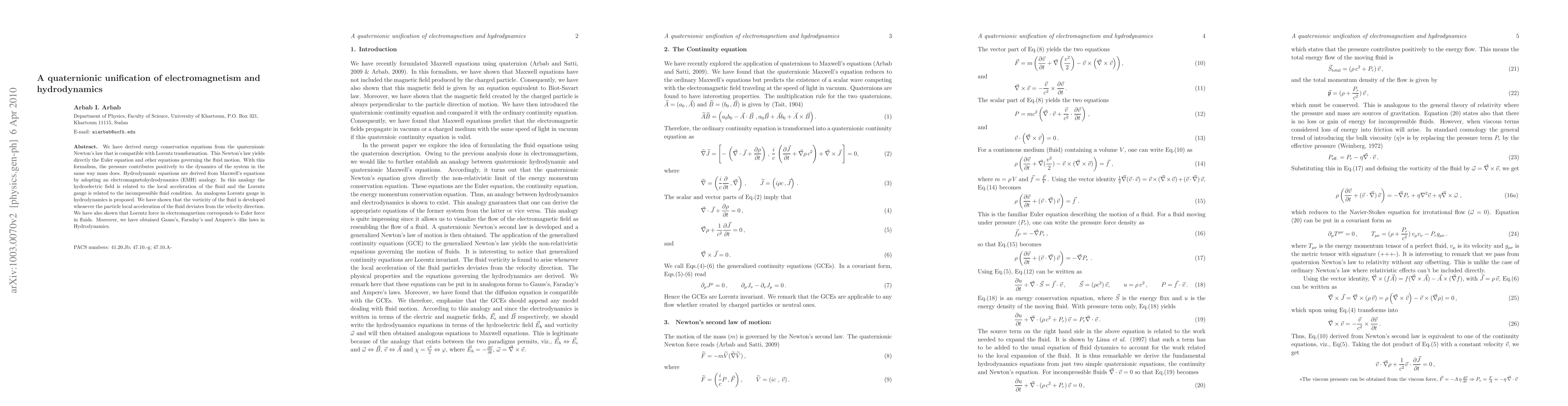 We have derived energy conservation equations from the quaternionic Newton's law that is compatible with Lorentz transformation. This Newton's law yields directly the Euler equation and other equations governing the fluid motion. With this formalism, the pressure contributes positively to the dynamics of the system in the same way mass does. Hydrodynamic equations are derived from Maxwell's equations by adopting an electromagnetohydrodynamics (EMH) analogy. In this analogy the hydroelectric field is related to the local acceleration of the fluid and the Lorentz gauge is related to the incompressible fluid condition. An analogous Lorentz gauge in hydrodynamics is proposed. We have shown that the vorticity of the fluid is developed whenever the particle local acceleration of the fluid deviates from the velocity direction. We have also shown that Lorentz force in electromagnetism corresponds to Euler force in fluids. Moreover, we have obtained Gauss's, Faraday's and Ampere's -like laws in Hydrodynamics.