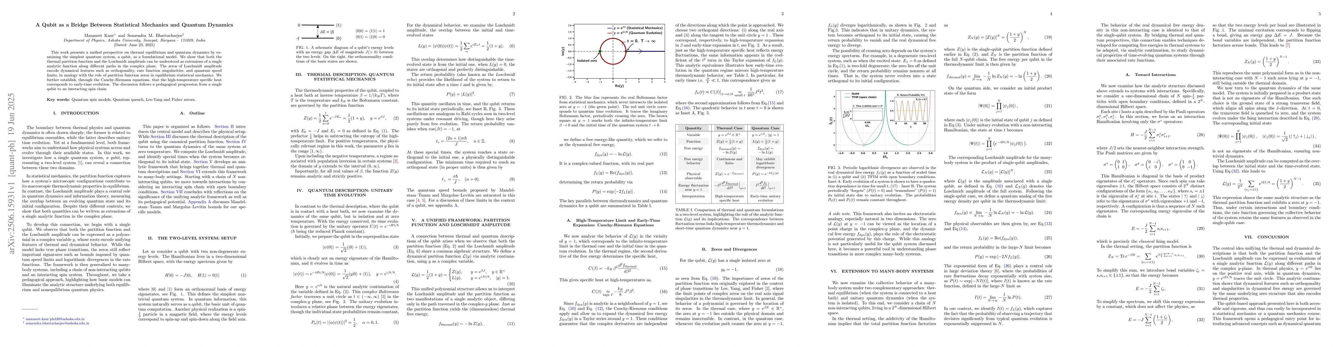 This work presents a unified perspective on thermal equilibrium and quantum dynamics by examining the simplest quantum system, a qubit, as a foundational model. We show that both the thermal partition function and the Loschmidt amplitude can be understood as extensions of a single analytic function along different paths in the complex plane. The zeros of Loschmidt amplitude encode dynamical features such as orthogonality, rate function singularities, and quantum speed limits, in analogy with the role of partition function zeros in equilibrium statistical mechanics. We further establish, through the Cauchy-Riemann equations, that the high-temperature specific heat corresponds to early-time evolution. The discussion follows a pedagogical progression from a single qubit to an interacting spin chain.