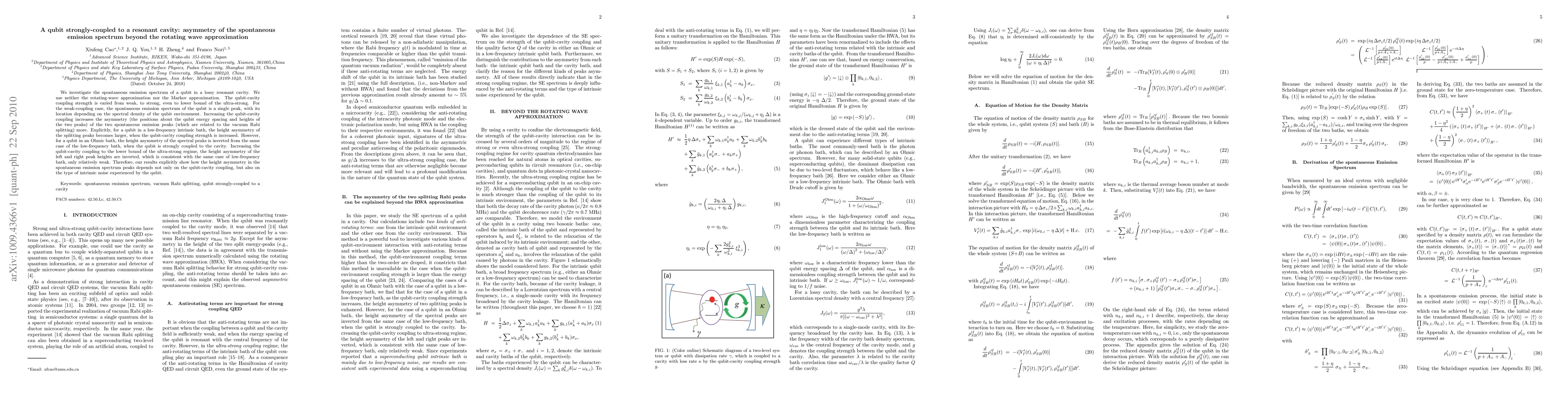 This paper examines the spontaneous emission spectrum of a qubit strongly coupled to a resonant cavity, beyond the rotating wave approximation. It finds that the asymmetry of the emission peaks depends on both the qubit-cavity coupling strength and the type of intrinsic noise, with significant inversions in peak height asymmetry observed in different coupling regimes.