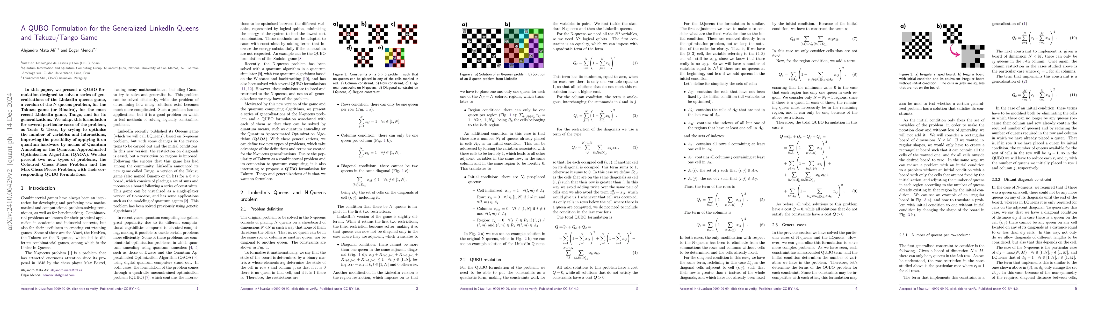 In this paper, we present a QUBO formulation designed to solve a series of generalisations of the LinkedIn queens game, a version of the N-queens problem. We adapt this formulation for several particular cases of the problem by trying to optimise the number of variables and interactions, improving the possibility of applying it on quantum hardware by means of Quantum Annealing or the Quantum Approximated Optimization Algorithm (QAOA). We also present two new types of problems, the Coloured Chess Piece Problem and the Max Chess Pieces Problem, with their corresponding QUBO formulations.