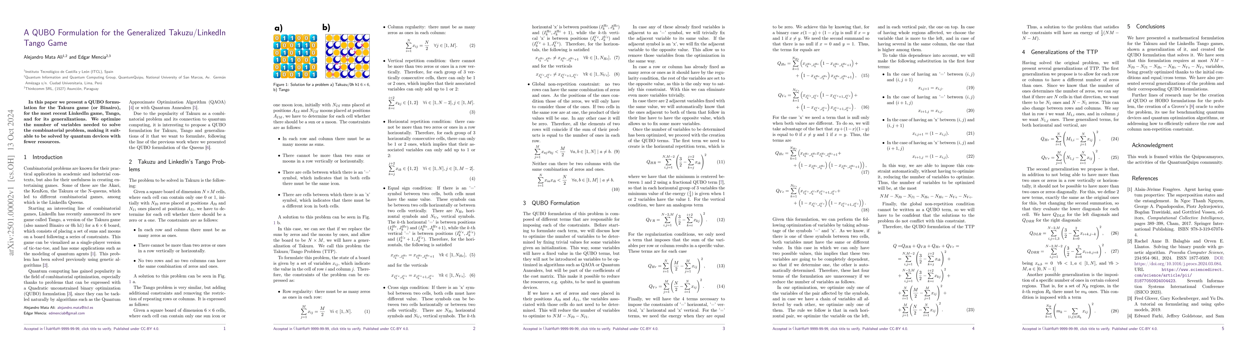 The paper introduces a QUBO formulation for the Takuzu/Binairo and its generalized version, LinkedIn Tango, optimizing the number of variables to enhance suitability for quantum computing devices. This approach aims to solve the combinatorial problem with fewer resources.