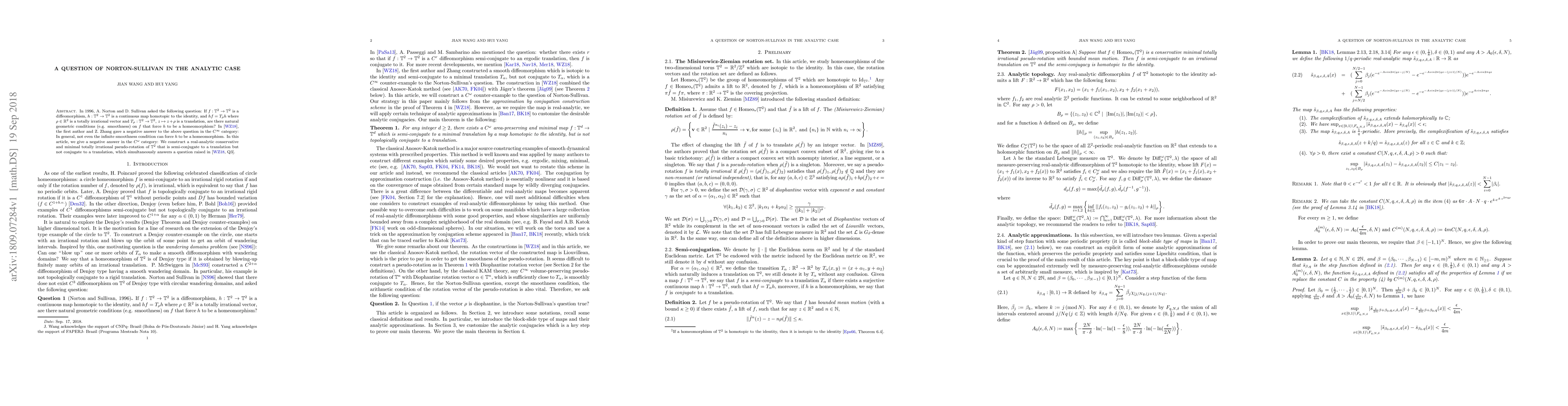 In 1996, A. Norton and D. Sullivan asked the following question: If $f:\mathbb{T}^2\rightarrow\mathbb{T}^2$ is a diffeomorphism, $h:\mathbb{T}^2\rightarrow\mathbb{T}^2$ is a continuous map homotopic to the identity, and $h f=T_{\rho} h$ where $\rho\in\mathbb{R}^2$ is a totally irrational vector and $T_{\rho}:\mathbb{T}^2\rightarrow\mathbb{T}^2,\, z\mapsto z+\rho$ is a translation, are there natural geometric conditions (e.g. smoothness) on $f$ that force $h$ to be a homeomorphism? In [ J. Wang and Z. Zhang, GAFA 2018 ], the first author and Z. Zhang gave a negative answer to the above question in the $C^{\infty}$ category: In general, not even the infinite smoothness condition can force $h$ to be a homeomorphism. In this article, we give a negative answer in the $C^{\omega}$ category: We construct a real-analytic conservative and minimal totally irrational pseudo-rotation of $\mathbb{T}^2$ that is semi-conjugate to a translation but not conjugate to a translation, which simultaneously answers a question raised in [ J. Wang and Z. Zhang, GAFA 2018 ].