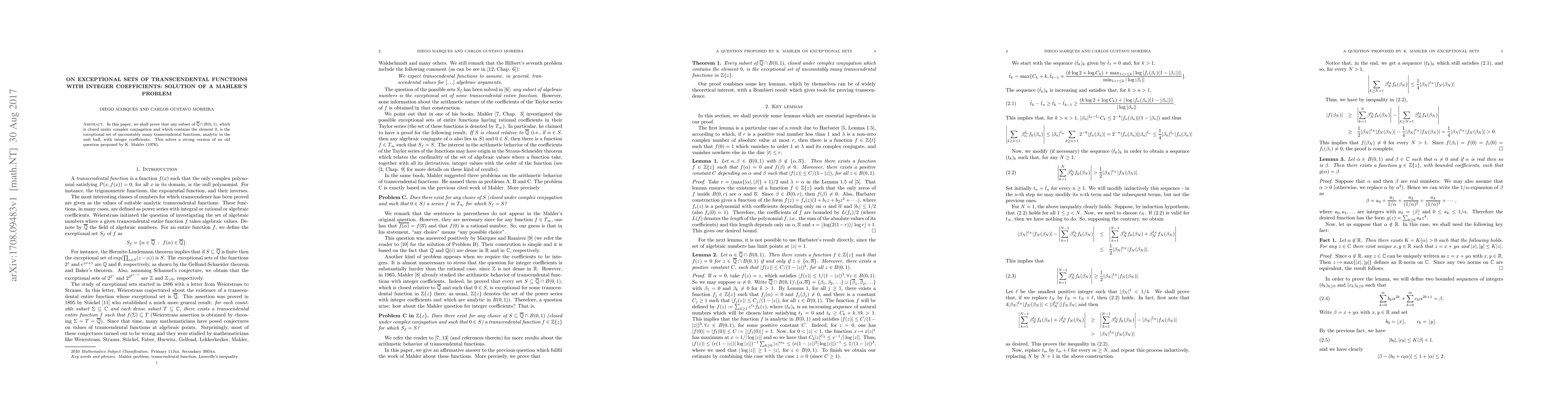 Summary: This paper proves that any closed-under-conjugation subset of rational algebraic numbers within the unit ball containing zero is an exceptional set for uncountably many transcendental functions with integer coefficients. It resolves a strengthened version of Mahler's 1976 question.
