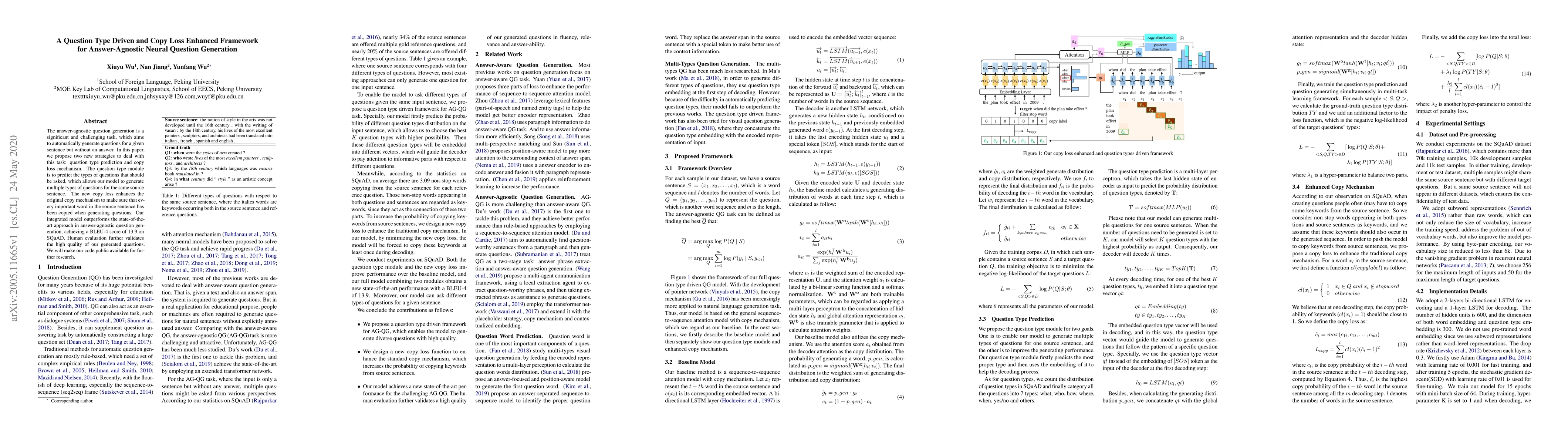This paper proposes a framework for answer-agnostic neural question generation using question type prediction and a copy loss mechanism to ensure important words are retained. The model outperforms existing methods, achieving a BLEU-4 score of 13.9 on SQuAD and receiving positive human evaluation.