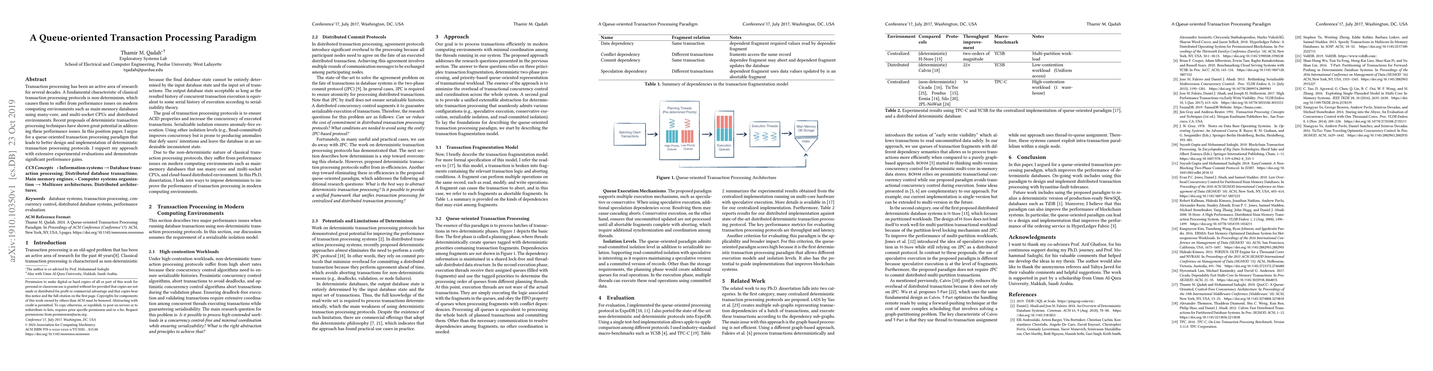 This paper proposes a queue-oriented transaction processing paradigm to address performance issues in classical non-deterministic transaction protocols. Experimental evaluations show significant performance gains, supporting the potential of deterministic transaction processing.
