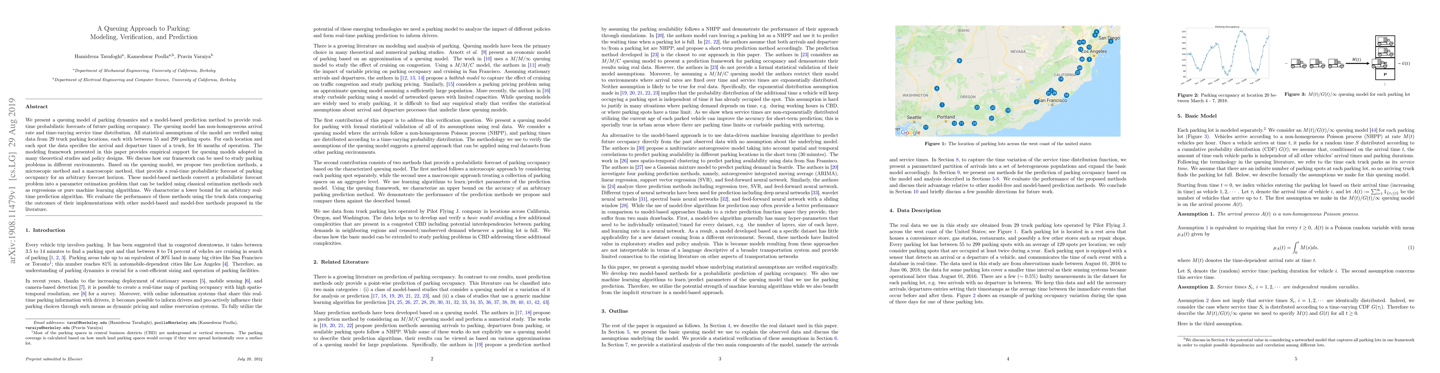 This paper develops a queuing model to analyze parking dynamics, incorporating non-homogeneous arrival rates and time-varying service times. It proposes two prediction methods for real-time probabilistic forecasts of parking occupancy, evaluated against truck data from 29 locations, and compares their performance with existing methods.