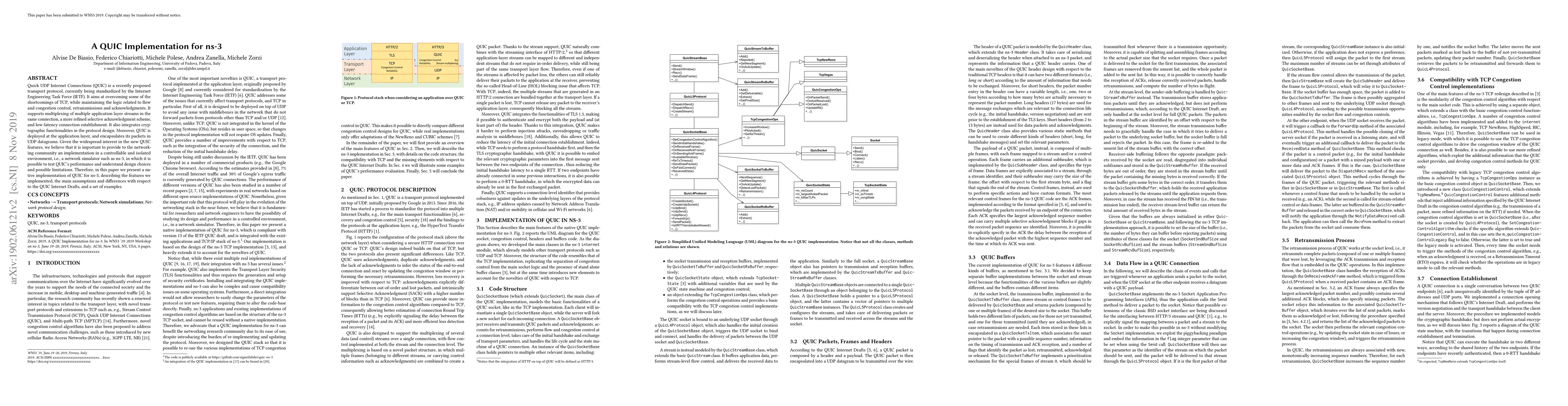 Quick UDP Internet Connections (QUIC) is a recently proposed transport protocol, currently being standardized by the Internet Engineering Task Force (IETF). It aims at overcoming some of the shortcomings of TCP, while maintaining the logic related to flow and congestion control, retransmissions and acknowledgments. It supports multiplexing of multiple application layer streams in the same connection, a more refined selective acknowledgment scheme, and low-latency connection establishment. It also integrates cryptographic functionalities in the protocol design. Moreover, QUIC is deployed at the application layer, and encapsulates its packets in UDP datagrams. Given the widespread interest in the new QUIC features, we believe that it is important to provide to the networking community an implementation in a controllable and isolated environment, i.e., a network simulator such as ns-3, in which it is possible to test QUIC's performance and understand design choices and possible limitations. Therefore, in this paper we present a native implementation of QUIC for ns-3, describing the features we implemented, the main assumptions and differences with respect to the QUIC Internet Drafts, and a set of examples.