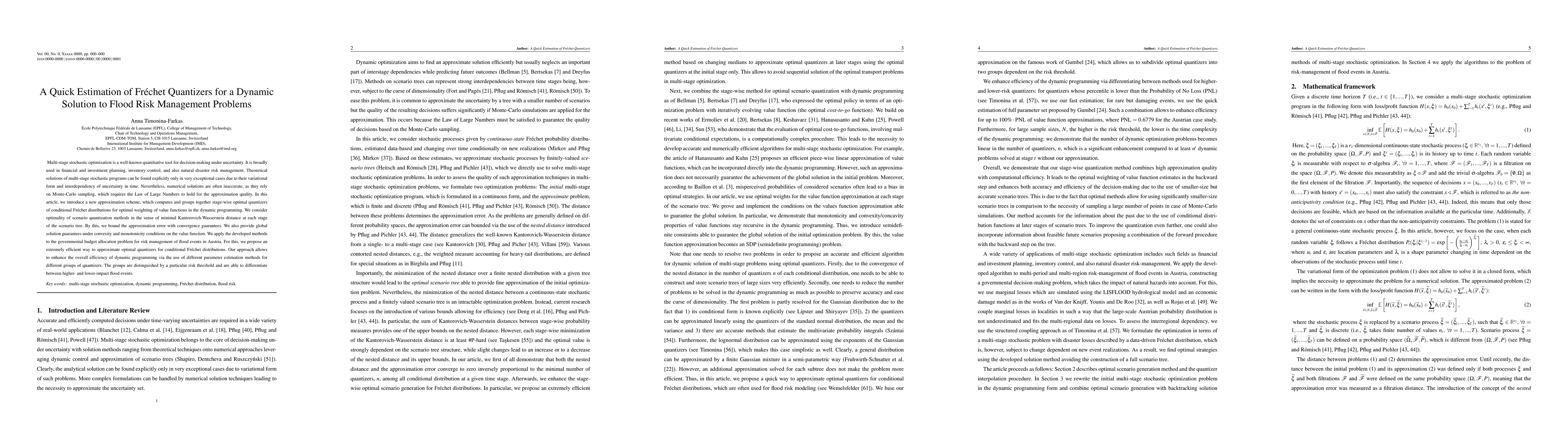Multi-stage stochastic optimization is a well-known quantitative tool for decision-making under uncertainty. It is broadly used in financial and investment planning, inventory control, and also natural disaster risk management. Theoretical solutions of multi-stage stochastic programs can be found explicitly only in very exceptional cases due to their variational form and interdependency of uncertainty in time. Nevertheless, numerical solutions are often inaccurate, as they rely on Monte-Carlo sampling, which requires the Law of Large Numbers to hold for the approximation quality. In this article, we introduce a new approximation scheme, which computes and groups together stage-wise optimal quantizers of conditional Fr\'echet distributions for optimal weighting of value functions in the dynamic programming. We consider optimality of scenario quantization methods in the sense of minimal Kantorovich-Wasserstein distance at each stage of the scenario tree. By this, we bound the approximation error with convergence guarantees. We also provide global solution guarantees under convexity and monotonicity conditions on the value function. We apply the developed methods to the governmental budget allocation problem for risk management of flood events in Austria. For this, we propose an extremely efficient way to approximate optimal quantizers for conditional Fr\'echet distributions. Our approach allows to enhance the overall efficiency of dynamic programming via the use of different parameter estimation methods for different groups of quantizers. The groups are distinguished by a particular risk threshold and are able to differentiate between higher- and lower-impact flood events.