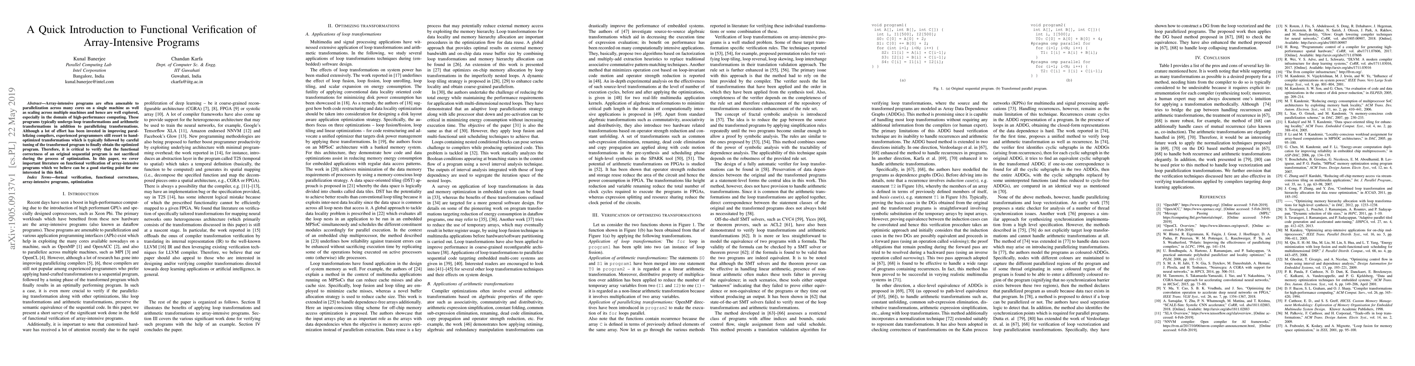 Array-intensive programs are often amenable to parallelization across many cores on a single machine as well as scaling across multiple machines and hence are well explored, especially in the domain of high-performance computing. These programs typically undergo loop transformations and arithmetic transformations in addition to parallelizing transformations. Although a lot of effort has been invested in improving parallelizing compilers, experienced programmers still resort to hand-optimized transformations which is typically followed by careful tuning of the transformed program to finally obtain the optimized program. Therefore, it is critical to verify that the functional correctness of an original sequential program is not sacrificed during the process of optimization. In this paper, we cover important literature on functional verification of array-intensive programs which we believe can be a good starting point for one interested in this field.
