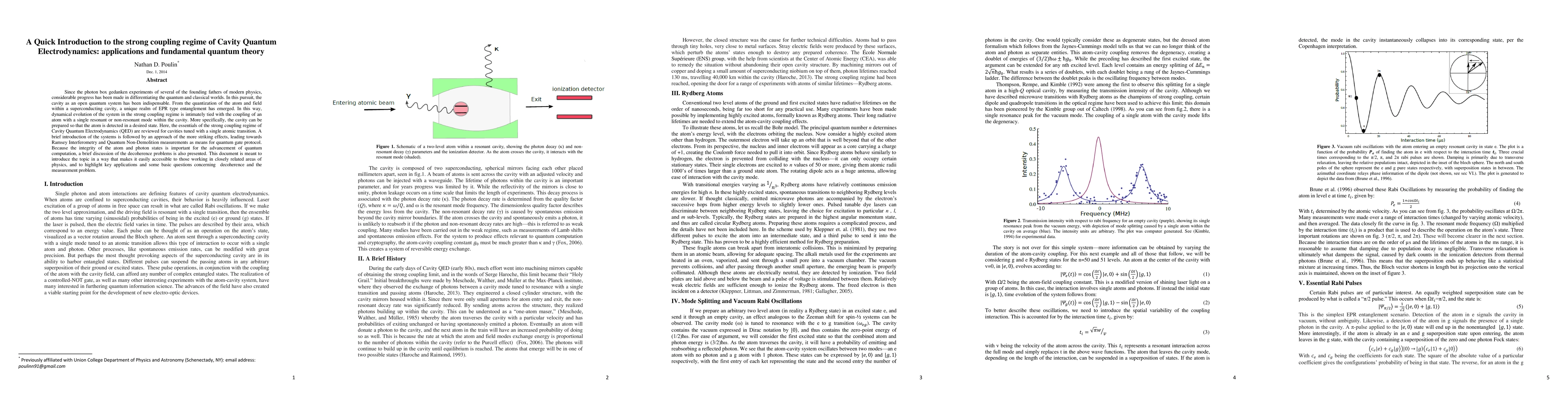Since the photon box gedanken experiments of several of the founding fathers of modern physics, considerable progress has been made in differentiating the quantum and classical worlds. In this pursuit, the cavity as an open quantum system has been indispensable. From the quantization of the atom and field within a superconducting cavity, a unique realm of EPR type entanglement has emerged. In this way, dynamical evolution of the system in the strong coupling regime is intimately tied with the coupling of an atom with a single resonant or non-resonant mode within the cavity. More specifically, the cavity can be prepared so that the atom is detected in a desired state. Here, the essentials of the strong coupling regime of Cavity Quantum Electrodynamics (QED) are reviewed for cavities tuned with a single atomic transition. A brief introduction of the systems is followed by an approach of the more striking effects, leading towards Ramsey Interferometry and Quantum Non-Demolition measurements as means for quantum gate protocol. Because the integrity of the atom and photon states is important for the advancement of quantum computation, a brief discussion of the decoherence problems is also presented. This document is meant to introduce the topic in a way that makes it easily accessible to those working in closely related areas of physics, and to highlight key applications and some basic questions concerning decoherence and the measurement problem.