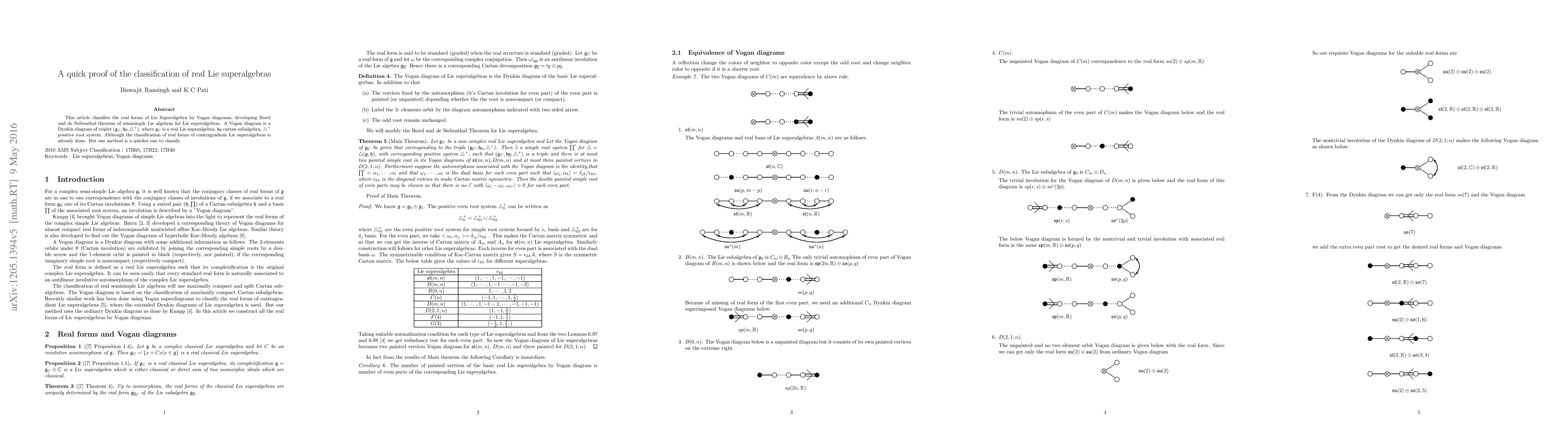 This article classifies the real forms of Lie Superalgebra by Vogan diagrams, developing Borel and de Seibenthal theorem of semisimple Lie algebras for Lie superalgebras. A Vogan diagram is a Dynkin diagram of triplet $(\mathfrak{g}_{C},\mathfrak{h_{\bar{0}}},\triangle^{+})$, where $\mathfrak{g}_{C}$ is a real Lie superalgebra, $\mathfrak{h_{\bar{0}}}$ cartan subalgebra, $\triangle^{+}$ positive root system. Although the classification of real forms of contragradient Lie superalgebras is already done. But our method is a quicker one to classify.