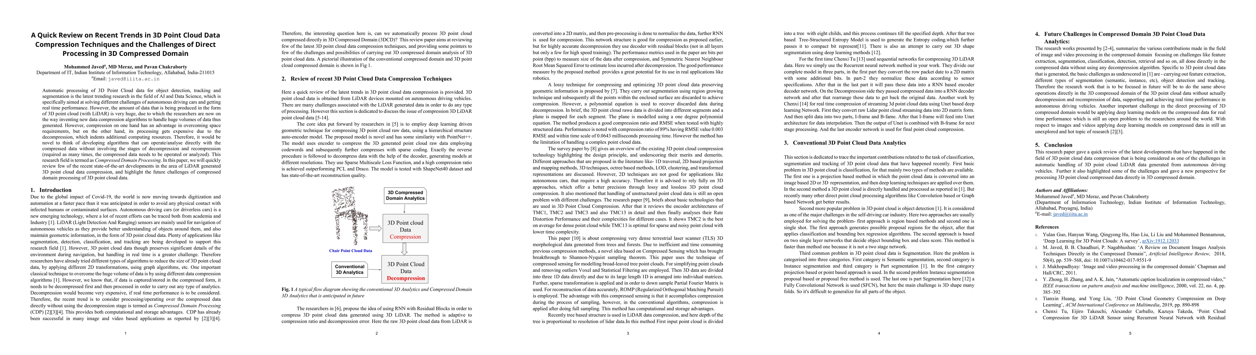 Automatic processing of 3D Point Cloud data for object detection, tracking and segmentation is the latest trending research in the field of AI and Data Science, which is specifically aimed at solving different challenges of autonomous driving cars and getting real time performance. However, the amount of data that is being produced in the form of 3D point cloud (with LiDAR) is very huge, due to which the researchers are now on the way inventing new data compression algorithms to handle huge volumes of data thus generated. However, compression on one hand has an advantage in overcoming space requirements, but on the other hand, its processing gets expensive due to the decompression, which indents additional computing resources. Therefore, it would be novel to think of developing algorithms that can operate/analyse directly with the compressed data without involving the stages of decompression and recompression (required as many times, the compressed data needs to be operated or analyzed). This research field is termed as Compressed Domain Processing. In this paper, we will quickly review few of the recent state-of-the-art developments in the area of LiDAR generated 3D point cloud data compression, and highlight the future challenges of compressed domain processing of 3D point cloud data.