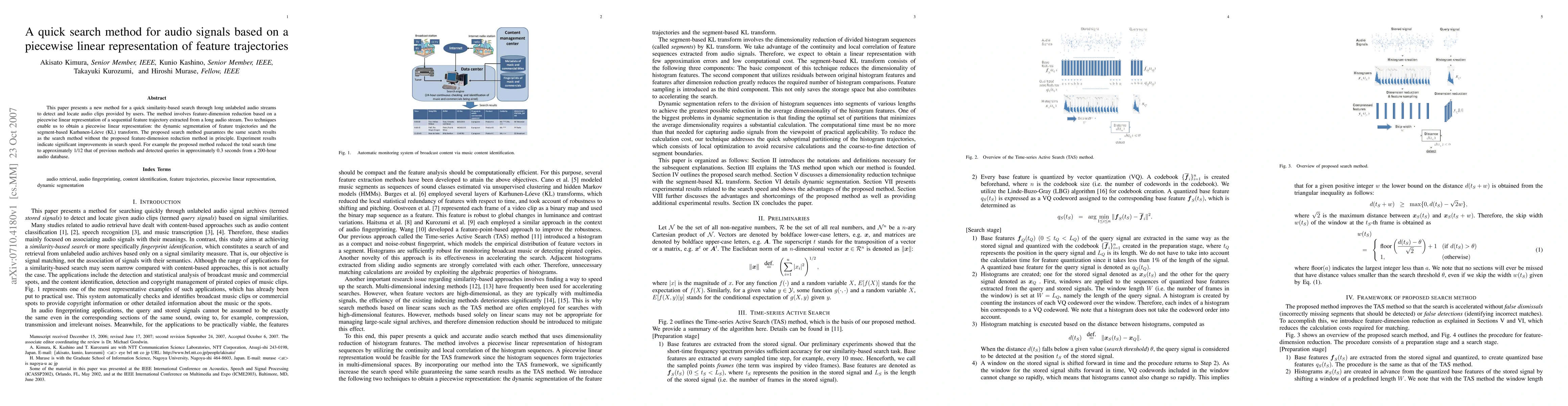 This paper introduces a fast search method for long audio streams using a piecewise linear representation of feature trajectories, significantly reducing search time by approximately 1/12 compared to previous methods. The method employs dynamic segmentation and segment-based Karhunen-Loève transform for feature-dimension reduction while maintaining search accuracy.