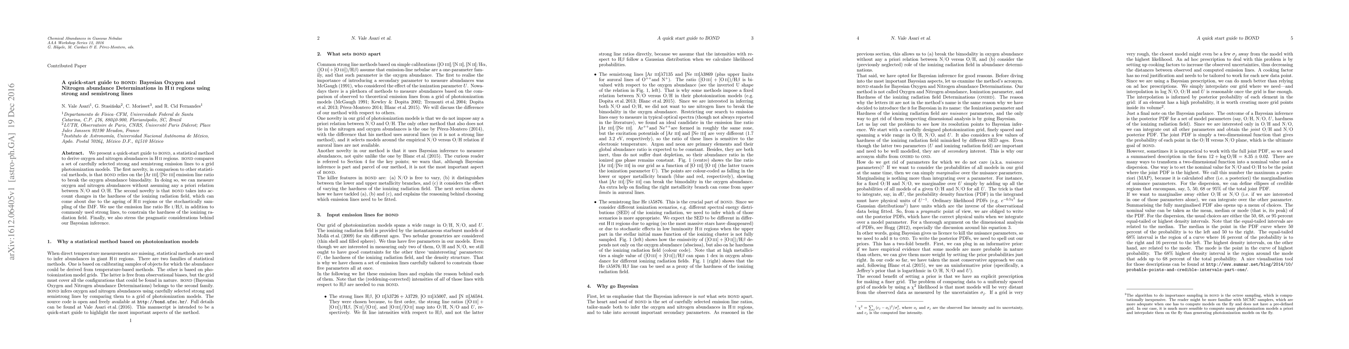 We present a quick-start guide to BOND, a statistical method to derive oxygen and nitrogen abundances in H II regions. BOND compares a set of carefully selected strong and semistrong emission lines to a grid photoionization models. The first novelty, in comparison to other statistical methods, is that BOND relies on the [Ar III]/[Ne III] emission line ratio to break the oxygen abundance bimodality. In doing so, we can measure oxygen and nitrogen abundances without assuming any a priori relation between N/O and O/H. The second novelty is that BOND takes into account changes in the hardness of the ionizing radiation field, which can come about due to the ageing of H II regions or the stochastically sampling of the IMF. We use the emission line ratio He I/Hb, in addition to commonly used strong lines, to constrain the hardness of the ionizing radiation field. Finally, we also stress the pragmatic considerations behind our Bayesian inference.