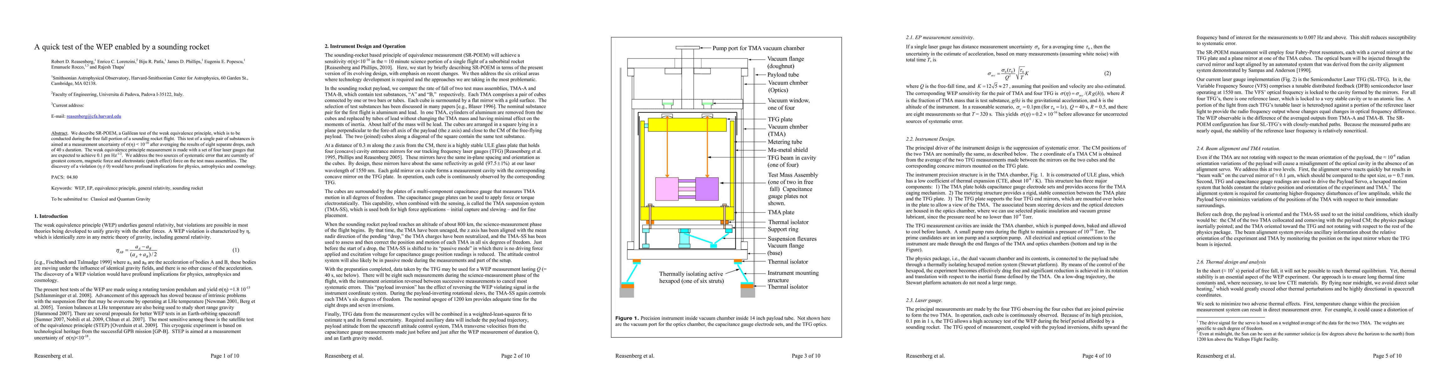 This paper details SR-POEM, a sounding rocket experiment designed to test the weak equivalence principle with high precision using laser gauges, aiming for an uncertainty of < 10^-16. The experiment addresses systematic errors from magnetic and electrostatic forces, with potential profound implications if a violation is detected.