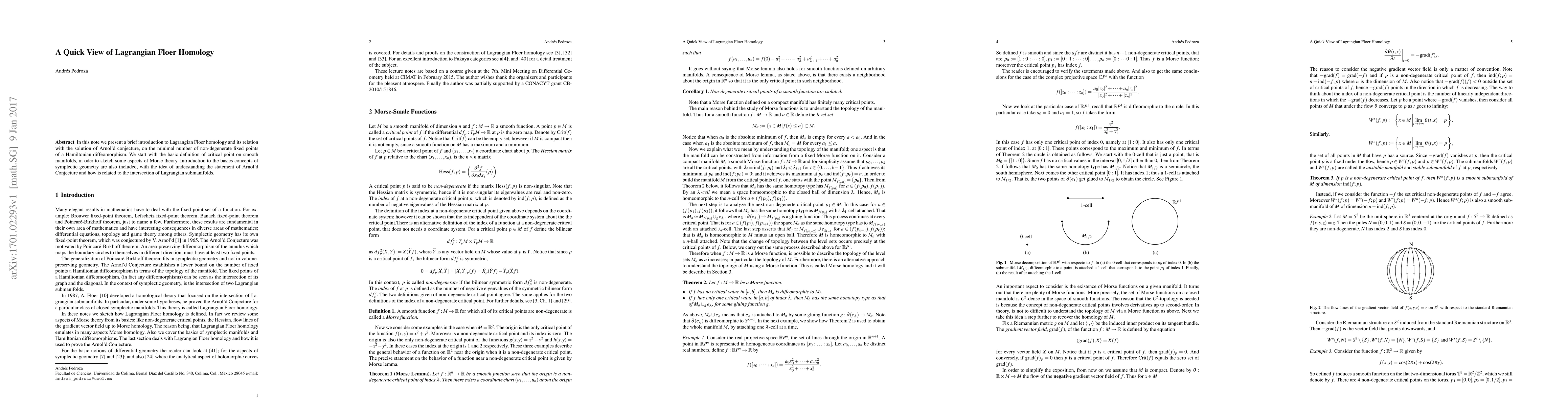 Summary: This paper provides a concise introduction to Lagrangian Floer homology, linking it to the solution of Arnol'd's conjecture regarding the minimal number of fixed points in Hamiltonian diffeomorphisms, and includes foundational concepts from Morse theory and symplectic geometry.