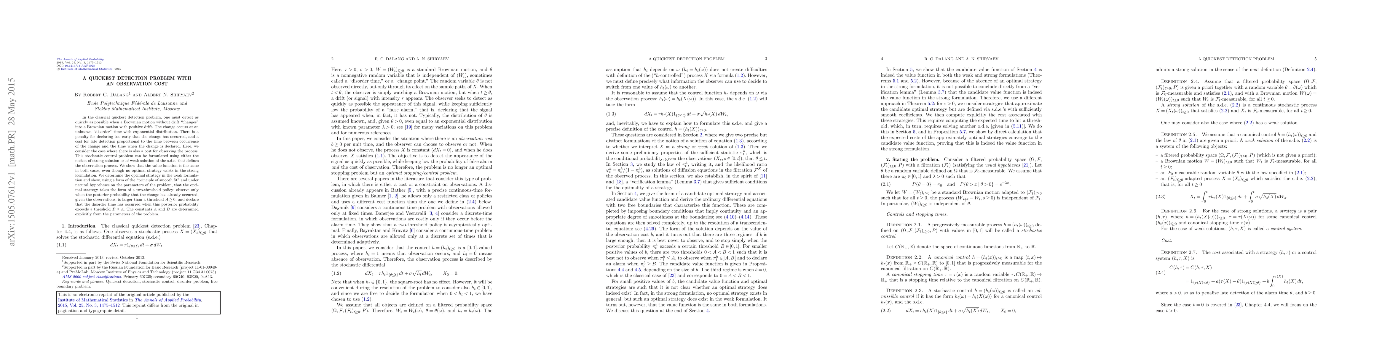 In the classical quickest detection problem, one must detect as quickly as possible when a Brownian motion without drift "changes" into a Brownian motion with positive drift. The change occurs at an unknown "disorder" time with exponential distribution. There is a penalty for declaring too early that the change has occurred, and a cost for late detection proportional to the time between occurrence of the change and the time when the change is declared. Here, we consider the case where there is also a cost for observing the process. This stochastic control problem can be formulated using either the notion of strong solution or of weak solution of the s.d.e. that defines the observation process. We show that the value function is the same in both cases, even though no optimal strategy exists in the strong formulation. We determine the optimal strategy in the weak formulation and show, using a form of the "principle of smooth fit" and under natural hypotheses on the parameters of the problem, that the optimal strategy takes the form of a two-threshold policy: observe only when the posterior probability that the change has already occurred, given the observations, is larger than a threshold $A\geq0$, and declare that the disorder time has occurred when this posterior probability exceeds a threshold $B\geq A$. The constants $A$ and $B$ are determined explicitly from the parameters of the problem.