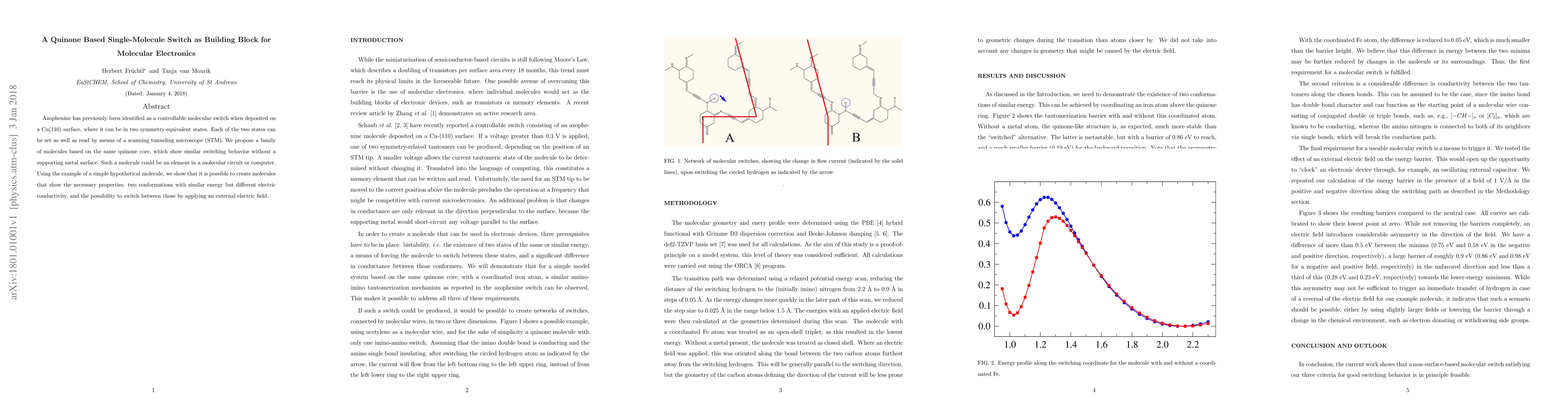 Azophenine has previously been identified as a controllable molecular switch when deposited on a Cu(110) surface, where it can be in two symmetry-equivalent states. Each of the two states can be set as well as read by means of a scanning tunneling microscope (STM). We propose a family of molecules based on the same quinone core, which show similar switching behavior without a supporting metal surface. Such a molecule could be an element in a molecular circuit or computer. Using the example of a simple hypothetical molecule, we show that it is possible to create molecules that show the necessary properties: two conformations with similar energy but different electric conductivity, and the possibility to switch between those by applying an external electric field.