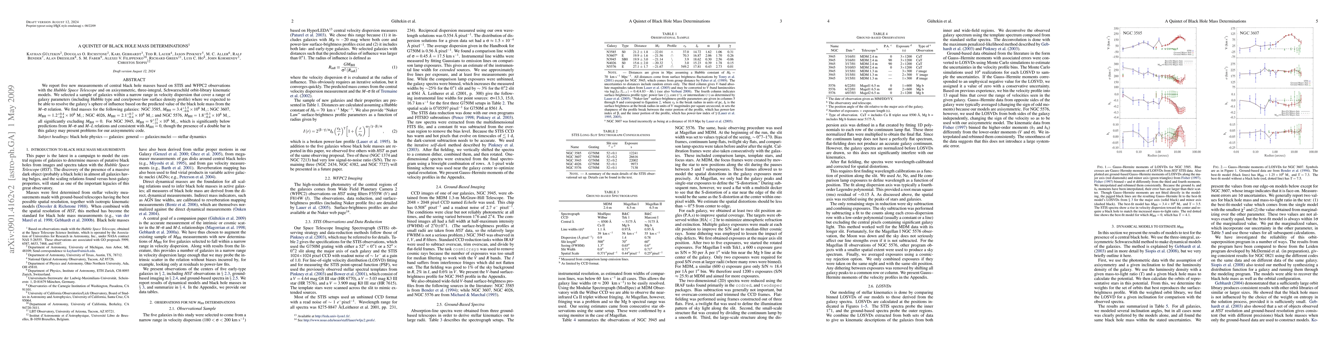 This study presents five new black hole mass measurements using Hubble Space Telescope data and Schwarzschild orbit-library kinematic models. The findings reveal black hole masses for NGC 3585, NGC 3607, NGC 4026, and NGC 5576, significantly excluding zero, and a lower mass for NGC 3945, consistent with M_BH = 0, challenging M-sigma and M-L relations.