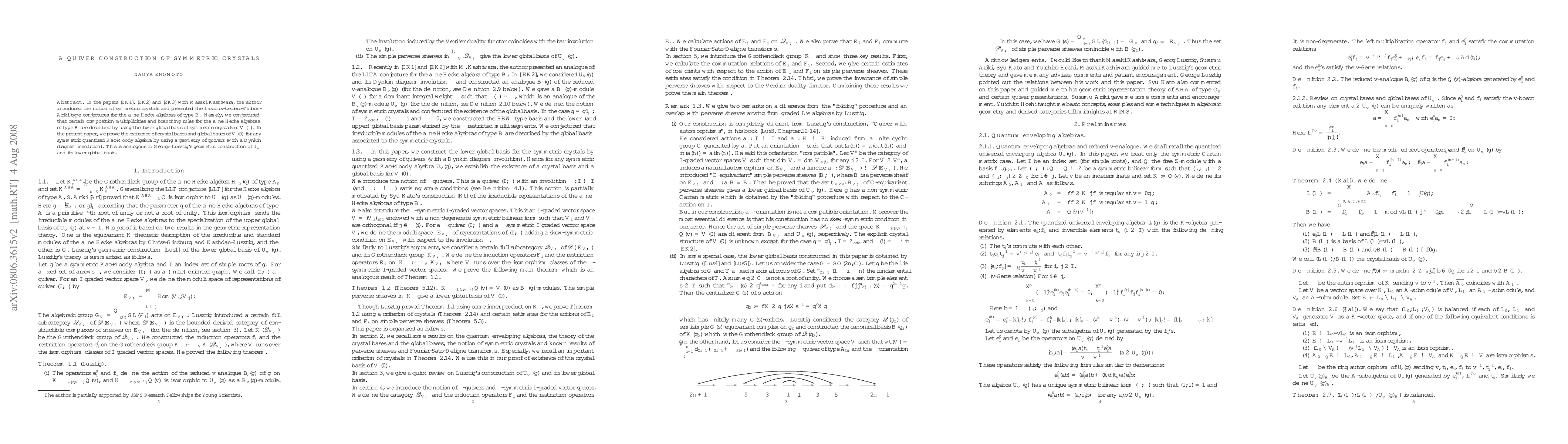 This paper proves the existence of crystal bases and global bases for symmetric crystals of $V_ heta(0)$ using a quiver geometry analogous to Lusztig's geometric construction.